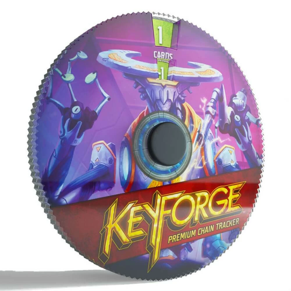 This KeyForge tournament-legal PREMIUM chain tracker – made out of premium printed acrylic – displays all current chains and the according limitations that they impose on card draw. The mechanical adjustment prevents accidental alteration. Coming in 7 different art styles (one for each of the game‘s first 7 houses), it fits perfectly in the accessories drawer of the KeyForge VAULT or the KeyForge GEMINI Deck Box.