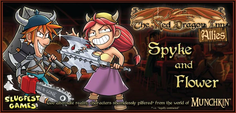 Spyke and Flower are munchkins – adventurers whose sole purpose in life is to kill monsters, take their stuff, and level up…so they can kill more monsters and take more stuff. In this alternate timeline, they’ve come to the Red Dragon Inn to see what’s up at this tavern that they’ve heard so much about… The Good: The tavern’s new patrons are eager to make a good impression. The Bad: It isn’t working. The Red Dragon Inn: Allies – Spyke and Flower is our first standalone Allies expansion, letting two players drink, brawl and gamble the night away to prove that they are the best munchkin around. It contains everything you need to play the game, including a brand new Drink Deck as well as a new automated third-player game variant. So play head to head with a friend, or combine this game with any of our other The Red Dragon Inn sets for parties of three or more players.
