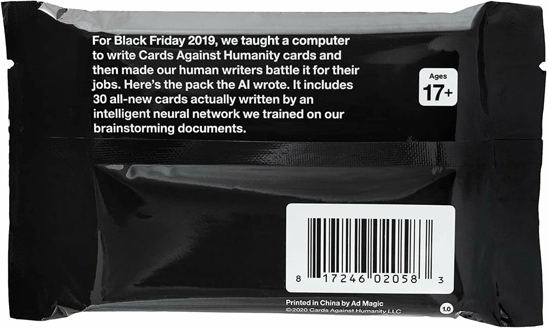 Who’s funnier: our human writers, or a computer? We taught a computer to how write Cards Against Humanity cards and on Black Friday 2019, our writers battled this powerful card-writing algorithm to see who could write the most popular new pack of cards. In the end, the computer lost and and the writers kept their jobs. Barely. Here’s the expansion pack the computer wrote.