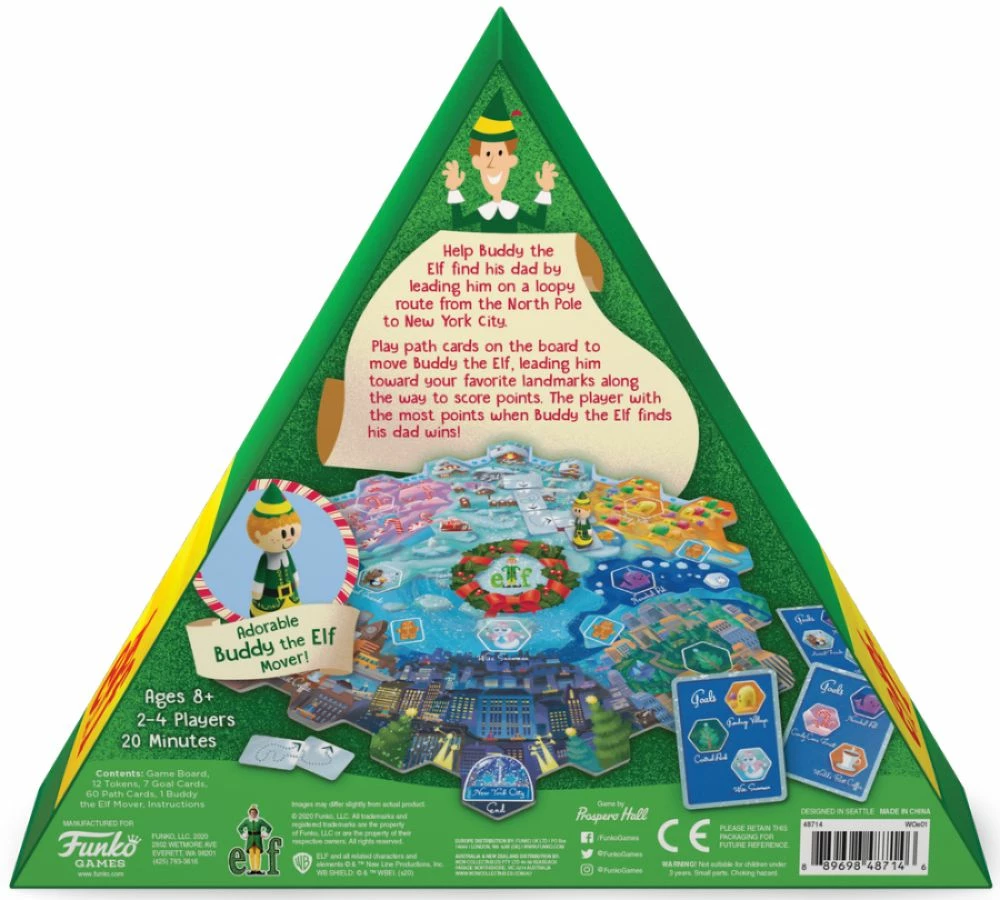 Help Buddy the Elf find his dad in Elf: Journey from the North Pole by laying a loopy route from the North Pole to New York City. Play path cards to the board and move Buddy along its crazy curves. Lead him toward your secret goal landmarks along the way to score points. The player with the most points when Buddy the Elf finds his dad wins! Ages: 8+ Players: 2-4 Duration: 20 minutes