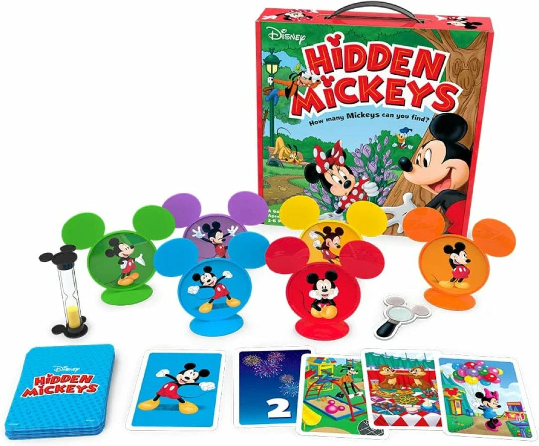 Includes 6 colored Mickey Markers and a Mickey-shaped sand timer. 30 beautifully illustrated scenes featuring Minnie, Goofy, Donald, Daisy, Pluto, Chip, and Dale. Each scene has between 4 and 7 cleverly incorporated Hidden Mickeys. Combines active hide-and-seek gameplay with picture-searching fun! Hidden Mickeys are a well-known and beloved Easter egg of Disney animated films and theme parks. Babysitter Approved: Easy to learn, easy to put away, and fun to play! For 2-6 Players 20-Minute Gameplay Ages 3+