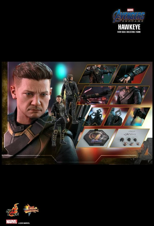 The grave course of events set in motion by Thanos that wiped out half the universe and fractured the Avengers ranks compels the remaining Avengers to take on final stand in Marvel Studios grand conclusion to twenty-two films, Avengers: Endgame. Hawkeyes fellow Avengers are called to action, his arrows and his newfound determination might be exactly what the super heroes will need to save the world. Given immense popularity of the character, Hot Toys is delighted to officially present the new 1/6th scale Hawkeye collectible figure based on upcoming movie Avengers: Endgame. Expertly crafted based on Jeremy Renners appearance as Hawkeye/Clint Barton in Avengers: Endgame with astonishing likeness, the highly-detailed collectible figure features a newly developed head sculpt, meticulously tailored costume, assorted weapons and accessories including bow and arrows, dagger, shurikens and a movie-themed figure stand with interchangeable graphic card. The 1/6th scale Hawkeye Collectible Figure specially features: – A newly developed head sculpt with authentic and detailed likeness of Jeremy Renner as Hawkeye from Avengers: Endgame – Movie-accurate facial features with detailed wrinkles and skin texture – Approximately 30 cm tall – Body with over 30 points of articulations – Six (6) pieces of interchangeable hands including: – One (1) pair of fists – One (1) pair of open hands – One (1) right hand for holding bow – One (1) left hand for holding arrow – Each piece of head sculpt is specially hand-painted Costume: – One (1) black colored vest – One (1) perfectly tailored black colored long sleeves top – One (1) pair of black colored pants with knee guards – One (1) pair of black colored boots – One (1) black colored utility belt on waist – One (1) cross-body shoulder belt – One (1) pair of arm guards Weapons: – One (1) black colored bow – Ten (10) individual arrows and twelve (12) interchangeable arrowheads of different styles – One (1) dagger – Two (2) shurikens in opened mode – Two (2) shurikens in closed mode Accessories: – One (1) arrow quiver (attachable to cross-body belt) – Movie-theme figure stand with character name Artists: – Head Sculpted by So Young Jang – Head Painted by E-Lee & JC.Hong – Head Art Directed by JC. Hong
