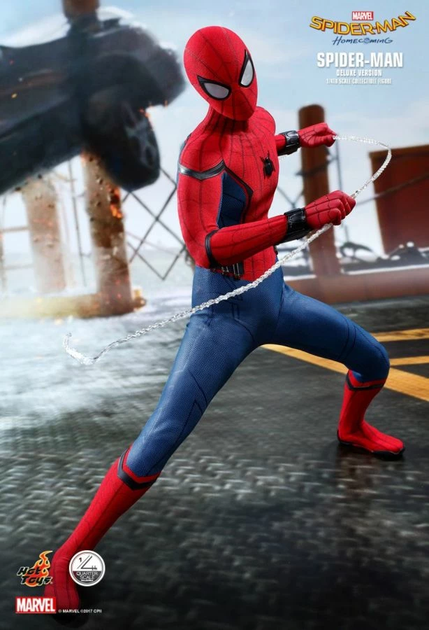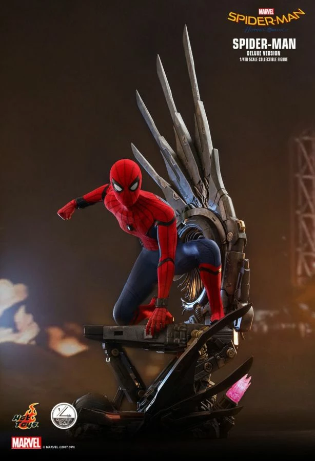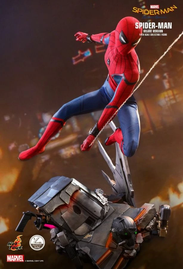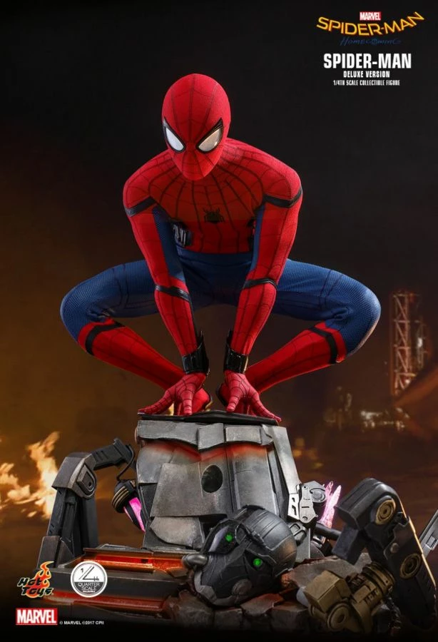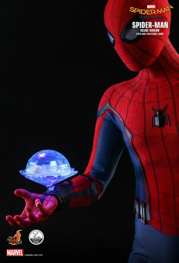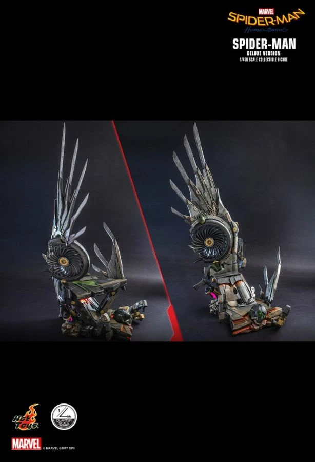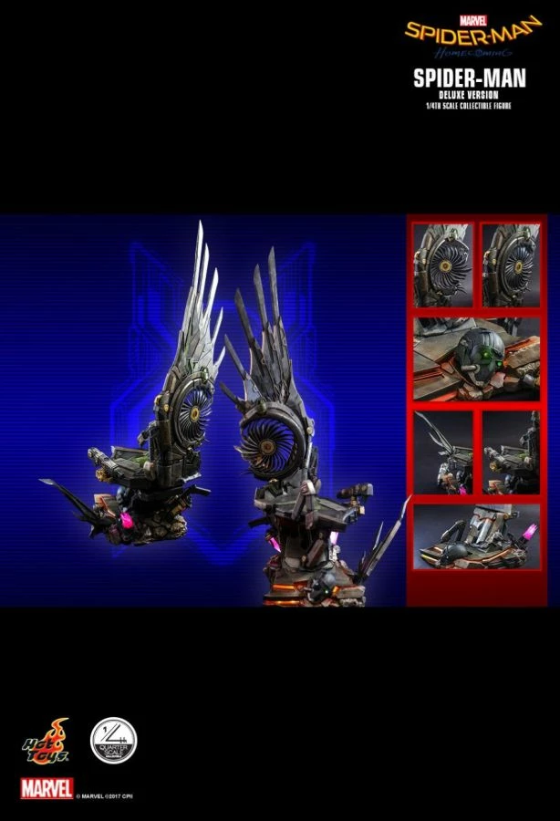 “So, to become an Avenger, are there like trials?” – Peter Parker After the events of Captain America: Civil War, Young Peter Parker tries to fall back into his normal daily routine and navigate his newfound identity as the web-slinging super hero, Spider Man. But against the commands of his mentor, Tony Stark, Peter must go under the radar and investigate the mysterious new super villain, The Vulture. In response to the enormous popularity of the collectibles created based on Spider-Man: Homecoming, Hot Toys is extremely thrilled today to present an upgraded version of your friendly neighborhood superhero inspired by the movie arriving in quarter scale with amazing details! The screen accurate 1/4th scale Spider-Man collectible figure is crafted based on the battling suit given to Peter Parker by Tony Stark, features a newly developed masked head sculpt with five pairs of interchangeable eye pieces to create numerous combinations of Spider-Man �s expressions, a newly developed interchangeable head sculpt with remarkable likeness of Tom Holland, a newly developed specialized body stands approximately 43.5cm tall, an expertly tailored and greatly detailed costume, a pair of magnetically attachable web-wings, an array of accessories including a Spider Drone, a projection mapping, a smart phone, a backpack, a Spider-Man mask, a variety of spider-web shooting effect parts, and a LED light-up diorama figure base with two lighting modes for alternative display inspired by the final fight scene between Spider-Man and The Vulture. The deluxe version will exclusively feature additional Vulture themed diorama parts designed to be interchangeable for passionate fans to develop their unique diorama display! The 1/4th scale Spider-Man Collectible Figure (Deluxe Version) specially features: – Authentic and detailed likeness of Spider-Man in Spider-Man: Homecoming – Newly developed interchangeable head sculpt with authentic likeness of Tom Holland as Peter Parker – Five (5) pairs of interchangeable Spider-Man eye pieces that can create numerous combinations of expressions – Newly developed body with 31 points of articulation – Approximately 43.5 cm tall – Ten (10) pieces of interchangeable hands with black cobweb pattern including: – One (1) pair of fists – One (1) pair of relaxed hands – One (1) pair of hands for cobweb shooting – One (1) pair of hands for cobweb swinging – One (1) pair of open hands – Each piece of head sculpt is specially hand-painted Costume : – One (1) newly developed red and blue colored Spider-Man suit embossed with grayish black trims, cobweb pattern and black spider emblem on chest – One (1) pair of red-color boots embossed with grayish black cobweb pattern – One (1) pair of black colored web shooter – One (1) pair of magnetic web-wings Accessories: – One (1) Spider Drone – One (1) GPS projection mapping – One (1) smart phone – One (1) beige backpack – One (1) Spider-Man mask (not wearable on figure) – Two (2) pieces of Spider sense sticker – Four (4) strings of spider web in different shapes and lengths, attachable to the web-shooters – One (1) open spider web effect accessory – Three (3) interchangeable Vulture themed diorama accessories*** – A specially designed Spider-Man vs. Vulture fight inspired diorama dynamic figure base features 2 LED lighting modes including general light effect and breathing light effect (battery operated) Artists: – Head Sculpted by So Young Jang – Head Painted by E-Lee & JC.Hong – Head Art Directed by JC.Hong – Diorama Figure Base designed by Studio HIVE