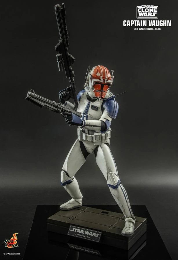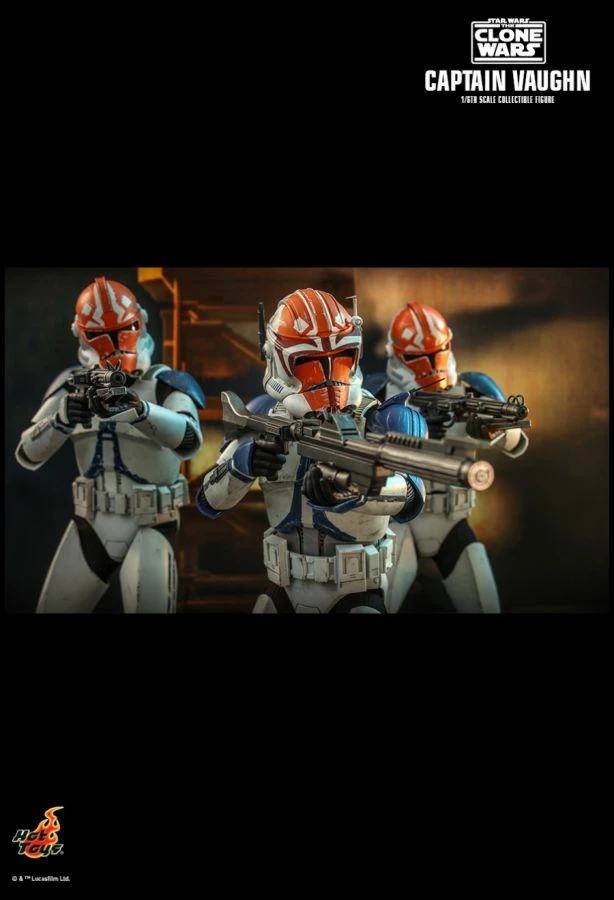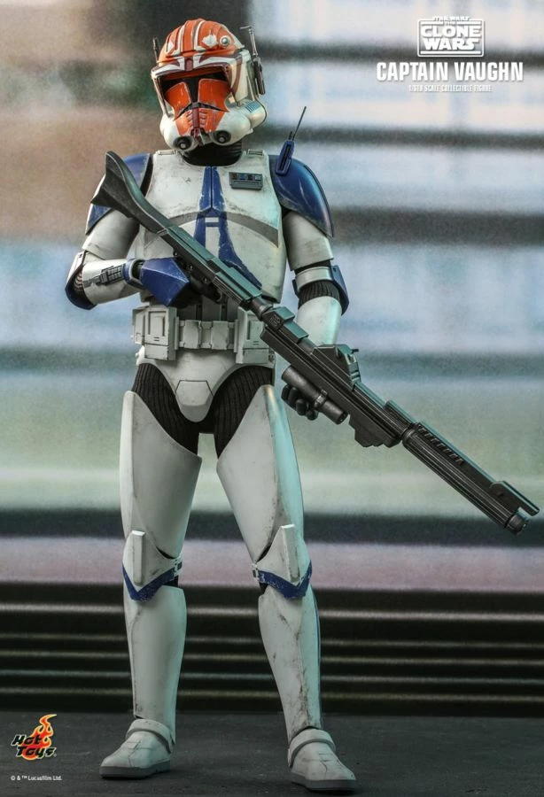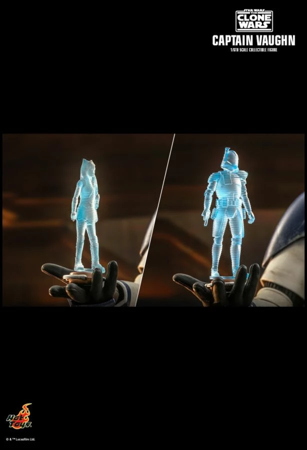 “I’m sorry, commander.” Serving in the 332nd Company in the Siege of Mandalore, Captain Vaughn fought alongside Ahsoka Tano™ in the battle to free the Mandalorian people from Maul. During the siege, Vaughn chased Mandalorian super commandos into the tunnels of the city, but unaware it was actually a trap… Continuing the expansion of the Star Wars: The Clone Wars collection, Hot Toys is delighted to present the new 1/6th scale Captain Vaughn collectible figure for all Star Wars collectors! The highly-detailed collectible figure is specially crafted based on the look of Vaughn in the acclaimed animation series. It features skillfully crafted Clone Trooper armor and helmet with weathering effects, two styles of blaster rifles, miniature holograms, and a display base! Captain Vaugh will be an excellent addition for enriching your Clone Troopers line-up! The 1/6th scale Captain Vaughn Collectible Figure specially features: – Authentic and detailed likeness of Captain Vaughn in Star Wars: The Clone Wars – Newly crafted Captain Vaughn helmet with details and weathering effects – Body with over 30 points of articulations – Approximately 30 cm tall – Seven (7) pieces of interchangeable gloved hands including: – One (1) pair of hands for holding gun – One (1) pair of relaxed hand – One (1) opened right hand – Two (2) gesture hands Costume: – One (1) Captain Vaughn armor with distinctive blue details and weathering effects – One (1) white colored utility belt – One (1) black colored under-suit – One (1) pair of white colored boots with weathering effects Weapons: – One (1) blaster rifle – One (1) blaster pistol Accessories: – One (1) jetpack (equipped with magnetic function) – One (1) hologram figure of Ahsoka Tano – One (1) hologram figure of Captain Rex – One (1) holoprojector – A dynamic figure stand with Star Wars logo and character nameplate