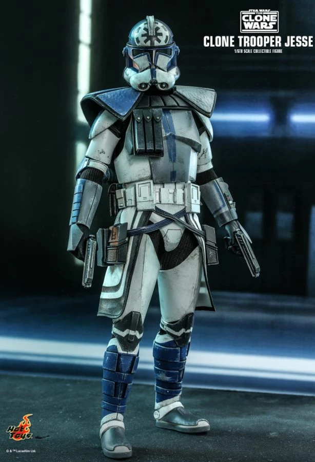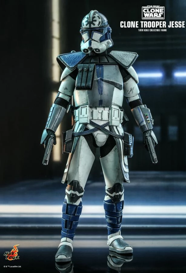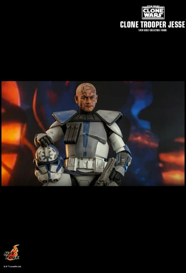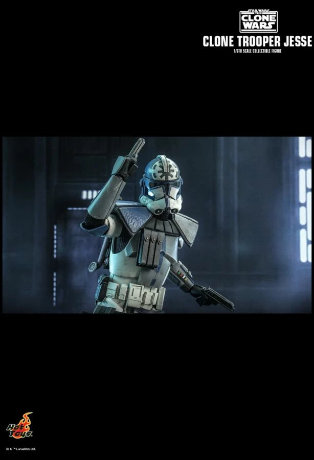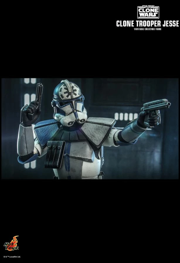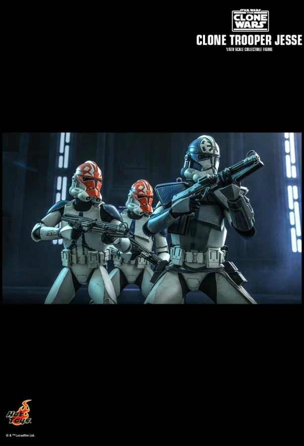 The clone troopers of the 501st Legion are a tight-knit bunch, loyal to their Jedi General, Anakin Skywalker™. Jesse is a hard-fighting patriot who proudly wears the cog-shaped symbol of the Galactic Republic on his helmet, and has a large tattoo that covers his face. After the execution of Order 66, however, Jesse and the rest of the clones are blindly loyal to the Emperor, and not even his brother, the clone known as Rex, can compete with the chip’s programming. Today Hot Toys is delighted to further expand its Star Wars: The Clone Wars collectible line-up, and officially present the new 1/6th scale Clone Trooper Jesse collectible figure inspired by the hit animation series! The realistically-detailed collectible figure is specially crafted based on the appearance of Jesse featuring wonderful recreation of his Clone Trooper armor and helmet, an interchangeable head sculpt with astonishing likeness, specially applied weathering effects, a pair of blaster pistols, a blaster rifle, a detachable backpack, miniature holograms, and a display base! The new 1/6th scale Clone Trooper Jesse Collectible Figure will surely be a great addition for your Star Wars: The Clone Wars collection! The 1/6th scale Clone Trooper Jesse Collectible Figure specially features: – Authentic and detailed likeness of Clone Trooper Jesse in Star Wars: The Clone Wars series – One (1) newly developed head sculpt with highly-accurate facial expression, detailed skin texture, and tattoos – One (1) newly crafted helmet with weathering effects and one (1) macrobinoculars – Approximately 30 cm tall – Body with over 30 points of articulations – Seven (7) pieces of interchangeable gloved hands including: – One (1) pair of hands for holding gun – One (1) pair of relaxed hand – One (1) opened right hand – Two (2) gesture hands – Each piece of head sculpt is specially hand-painted Costume: – One (1) finely crafted Jesse armor with distinctive blue details and weathering effects – One (1) pair of pauldron with magnetically attachable black chest pouch – One (1) white colored utility belt with attached command skirts and pistol holsters – One (1) black colored under-suit – One (1) pair of blue, white colored boots with weathering effects Weapons: – One (1) blaster rifle – Two (2) blaster pistols Accessories: – One (1) military backpack (equipped with magnetic function) – One (1) hologram figure of Darth Sidious – One (1) hologram figure of LAAT vehicle – One (1) holoprojector – A figure stand with Star Wars logo and character nameplate