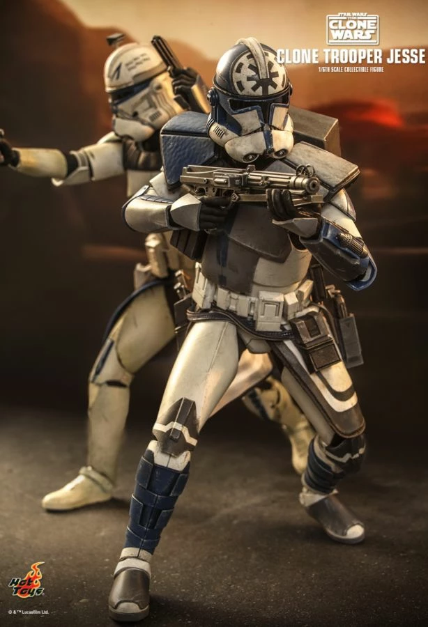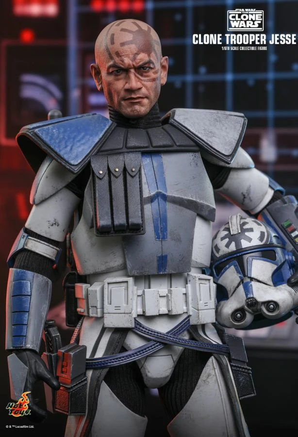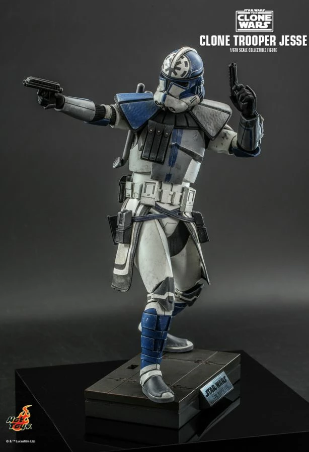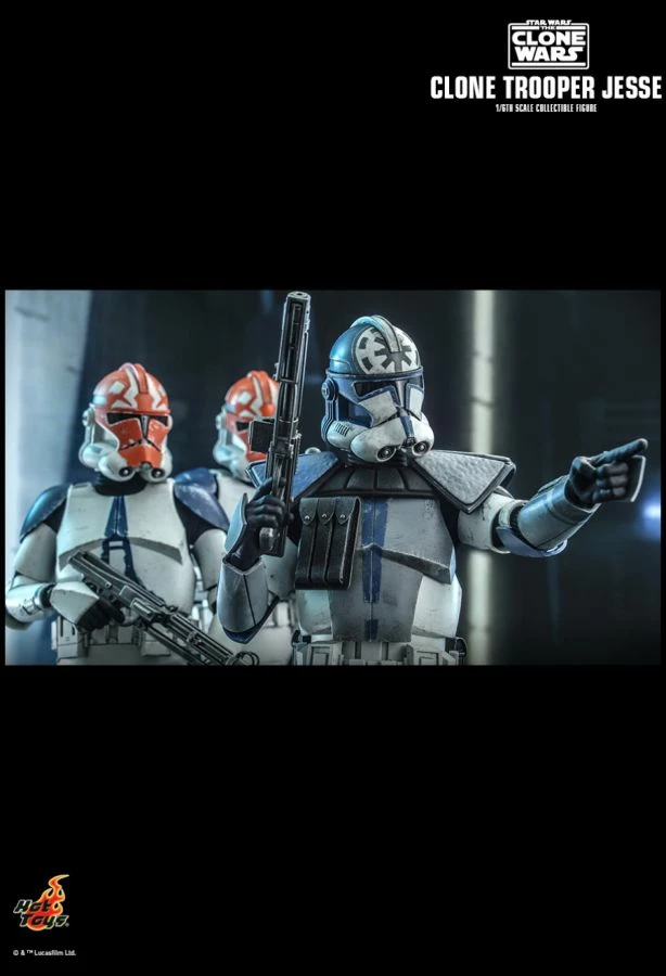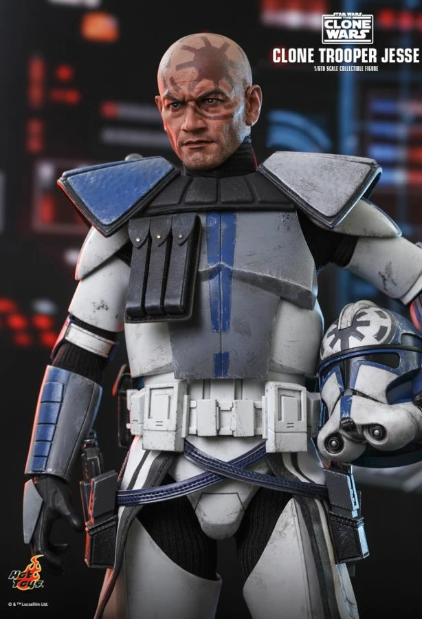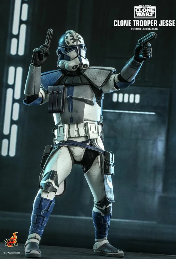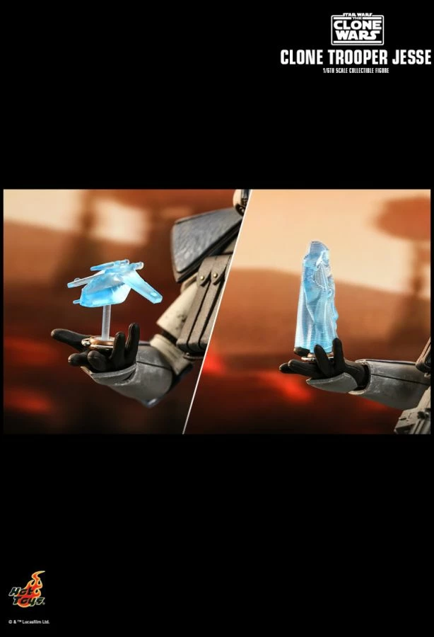 The clone troopers of the 501st Legion are a tight-knit bunch, loyal to their Jedi General, Anakin Skywalker™. Jesse is a hard-fighting patriot who proudly wears the cog-shaped symbol of the Galactic Republic on his helmet, and has a large tattoo that covers his face. After the execution of Order 66, however, Jesse and the rest of the clones are blindly loyal to the Emperor, and not even his brother, the clone known as Rex, can compete with the chip’s programming. Today Hot Toys is delighted to further expand its Star Wars: The Clone Wars collectible line-up, and officially present the new 1/6th scale Clone Trooper Jesse collectible figure inspired by the hit animation series! The realistically-detailed collectible figure is specially crafted based on the appearance of Jesse featuring wonderful recreation of his Clone Trooper armor and helmet, an interchangeable head sculpt with astonishing likeness, specially applied weathering effects, a pair of blaster pistols, a blaster rifle, a detachable backpack, miniature holograms, and a display base! The new 1/6th scale Clone Trooper Jesse Collectible Figure will surely be a great addition for your Star Wars: The Clone Wars collection! The 1/6th scale Clone Trooper Jesse Collectible Figure specially features: – Authentic and detailed likeness of Clone Trooper Jesse in Star Wars: The Clone Wars series – One (1) newly developed head sculpt with highly-accurate facial expression, detailed skin texture, and tattoos – One (1) newly crafted helmet with weathering effects and one (1) macrobinoculars – Approximately 30 cm tall – Body with over 30 points of articulations – Seven (7) pieces of interchangeable gloved hands including: – One (1) pair of hands for holding gun – One (1) pair of relaxed hand – One (1) opened right hand – Two (2) gesture hands – Each piece of head sculpt is specially hand-painted Costume: – One (1) finely crafted Jesse armor with distinctive blue details and weathering effects – One (1) pair of pauldron with magnetically attachable black chest pouch – One (1) white colored utility belt with attached command skirts and pistol holsters – One (1) black colored under-suit – One (1) pair of blue, white colored boots with weathering effects Weapons: – One (1) blaster rifle – Two (2) blaster pistols Accessories: – One (1) military backpack (equipped with magnetic function) – One (1) hologram figure of Darth Sidious – One (1) hologram figure of LAAT vehicle – One (1) holoprojector – A figure stand with Star Wars logo and character nameplate