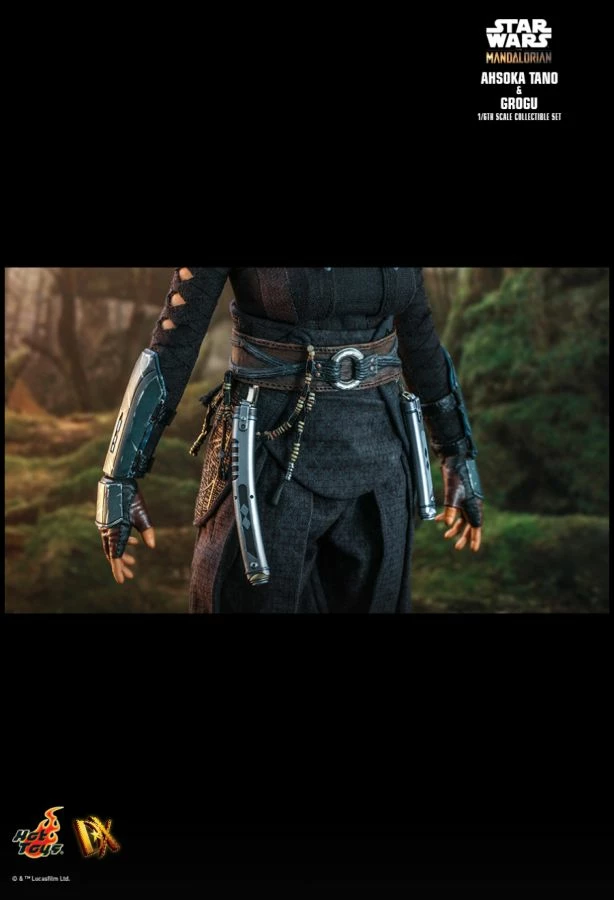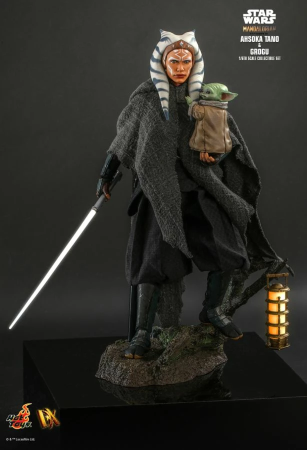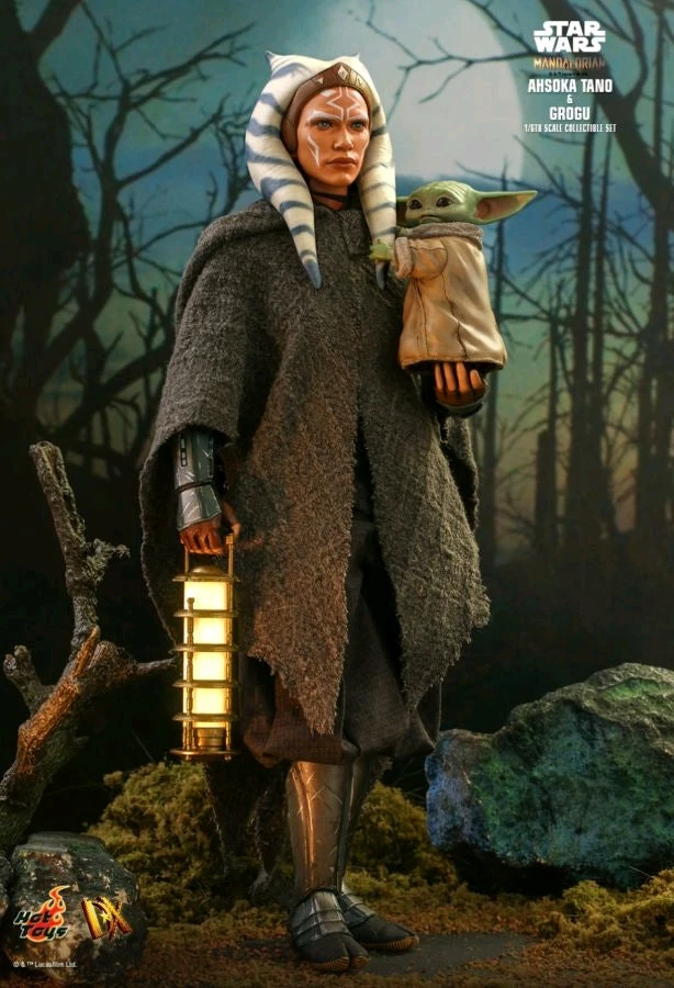 “Grogu and I can feel each other’s thoughts.” In the widely acclaimed The Mandalorian, our hero Din DjarinTM was quested to return the mysterious baby Grogu to his kind. In his journey across the galaxy, he was guided to seek out the former Jedi Ahsoka Tano on the forest planet of Corvus where Star Wars fans were elated to see the Togruta hero depicted in live-action for the first time! To further expand The Mandalorian collectible series, Hot Toys is delighted to introduce a new 1/6th scale collectible set from our proud DX Series, featuring Ahsoka Tano and Grogu for all Star Wars fans to enjoy! The highly-accurate Ahsoka collectible figure features a meticulously crafted head sculpt with separate rolling eyeballs features and articulated head-tails, specialized physique, skillfully tailored outfit with fine details, a pair of lightsabers, interchangeable lightsaber blades emulating the weapon in motion, and a cloak. The Grogu collectible figure is featuring a newly developed head sculpt with great likeness, articulated head and arms. This special set specially features a forest theme backdrop and display base along with a lantern to recreate the memorable scene when Ahsoka and Grogu first meet. Enhance your Star Wars collection now with this amazing collectible set that captures the memorable scene between two beloved characters! The 1/6th scale Ahsoka TanoTM Collectible Figure specially features: – Authentic and detailed likeness of Ahsoka Tano in Star Wars: The Mandalorian – Newly developed head sculpt with separate rolling eyeballs features – Highly-accurate facial expression, make up, and detailed facial patterns – Newly sculpted blue and white striped montrals and head-tails embedded with bendable wires – Body with over 28 points of articulations – Approximately 28.5 cm tall – Five (5) pieces of interchangeable hands including: – One (1) pair of relaxed hands – One (1) pair of lightsabers holding hands – One (1) right fist – Each piece of head sculpt is specially hand-painted Costume : – One (1) grey colored cloak with weathering effects (embedded with bendable wire) – One (1) grey colored vest with layered collars – One (1) pair of weathered gauntlets in bluish green with black colored forearm gloves – One (1) dark brown colored belt with detailed accessories – One (1) grey colored under belt with patterns – One (1) pair of finely tailored grey colored pants with patterns – One (1) pair of black colored shoes and bluish green colored armors with weathering effects Weapons: – One (1) pair lightsaber – One (1) pair of lightsaber blade in motion (attachable to the hilt) Accessories: – One (1) lantern – One (1) forest themed backdrop – Specially designed forest diorama dynamic figure base with tree trunk and rocks The 1/6th scale GroguTM Collectible Figure specially features: – Authentic and detailed likeness of Grogu in Star Wars: The Mandalorian – One (1) newly developed Grogu in standing posture (Approximately 6cm tall; with articulated function) – One (1) pair of interchangeable force-using hands – Each piece of head sculpt is specially hand-painted