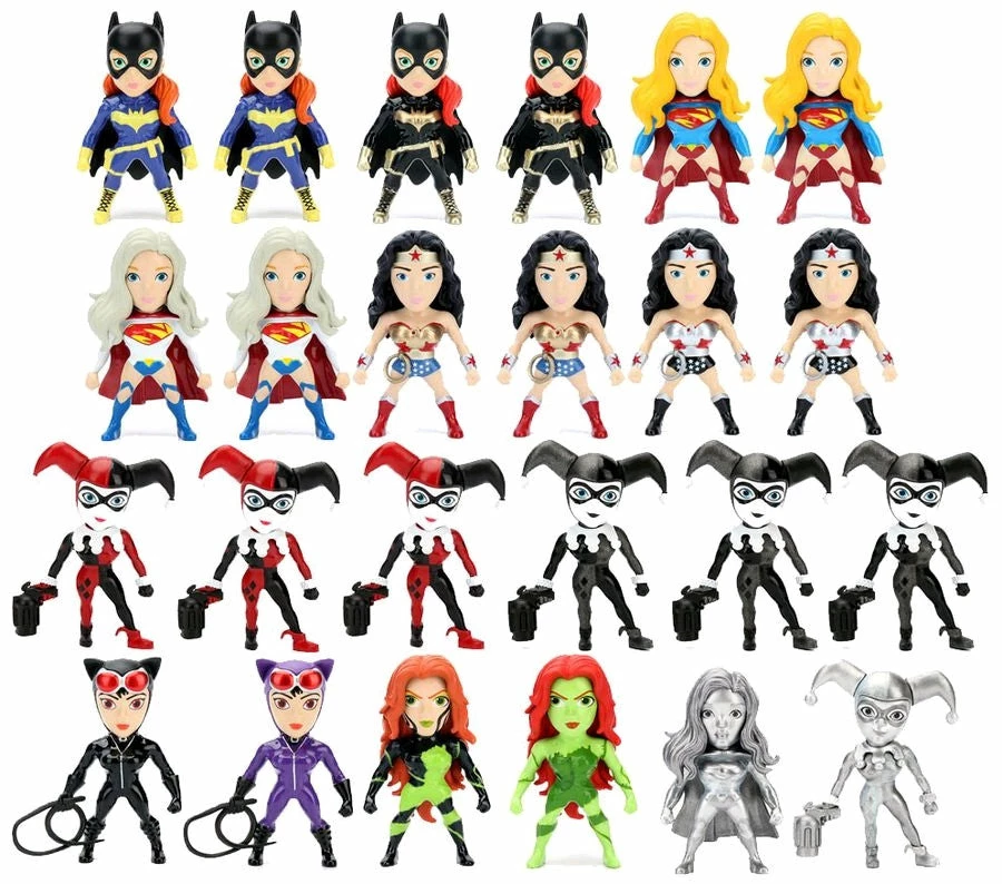 Assortment includes: 2 x Batgirl (Blue) 2 x Batgirl (Black) 2 x Supergirl (Blue) 2 x Supergirl (White) 2 x Wonder Woman (Gold) 2 x Wonder Woman (Silver) 3 x Harley Quinn Classic 3 x Harley Quinn Classic (Black & White) 1 x Catwoman (Black) 1 x Catwoman (Purple) 1 x Poison Ivy (New 52) 1 x Poison Ivy Classic 1 x Supergirl Bare Metal 1 x Harley Quinn Bare Metal