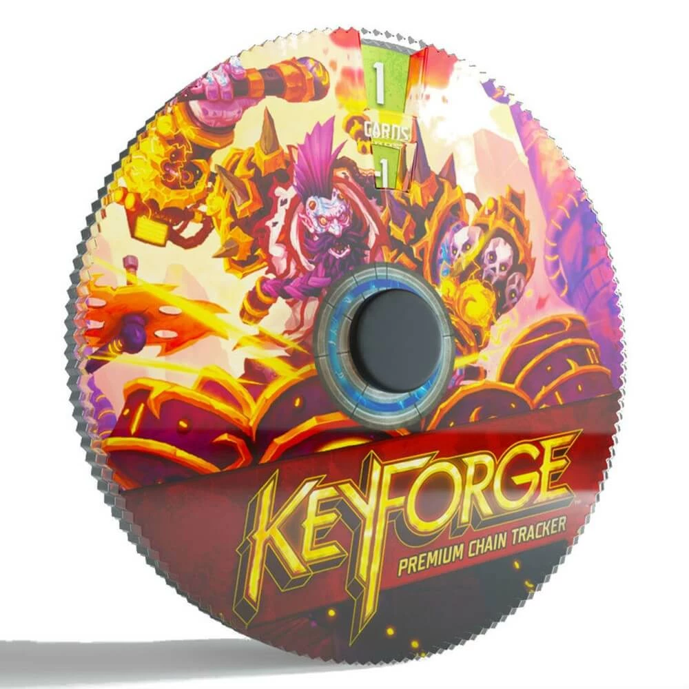 This KeyForge tournament-legal PREMIUM chain tracker – made out of premium printed acrylic – displays all current chains and the according limitations that they impose on card draw. The mechanical adjustment prevents accidental alteration. Coming in 7 different art styles (one for each of the game‘s first 7 houses), it fits perfectly in the accessories drawer of the KeyForge VAULT or the KeyForge GEMINI Deck Box.