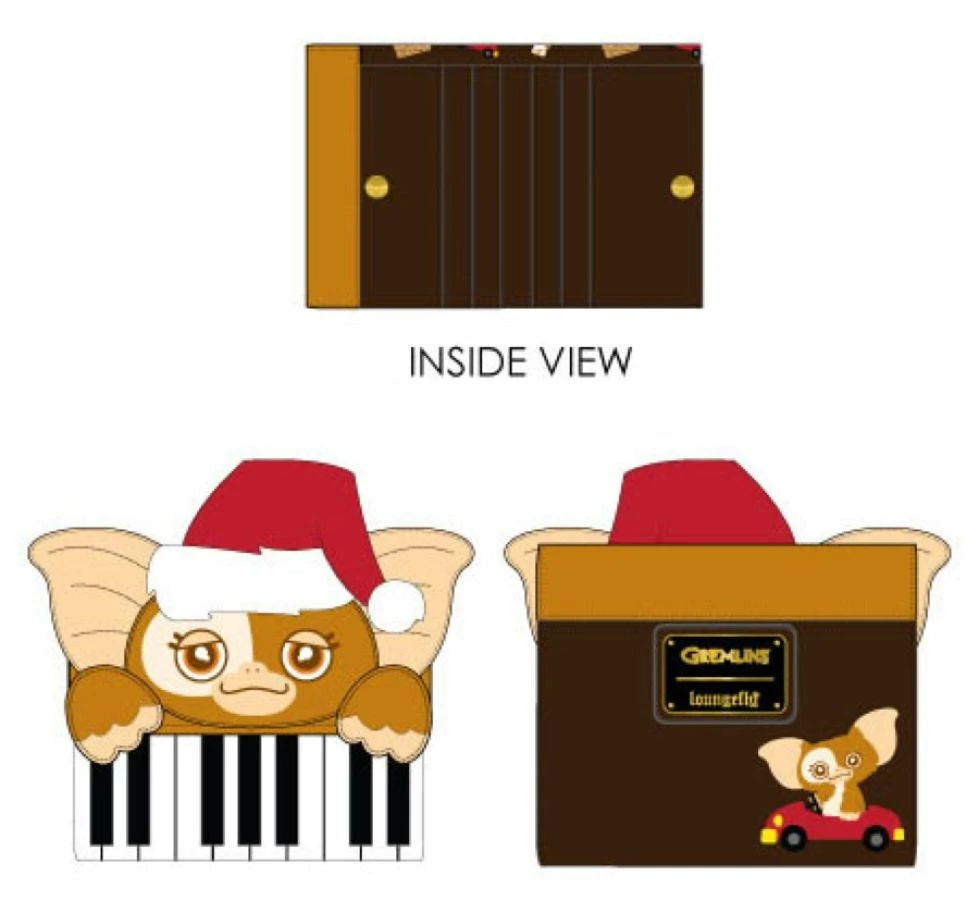 Beware! This mischievous Mogwai is looking to sneak into your collection as the Loungefly Gremlins Gizmo Holiday Keyboard Cosplay Flap Wallet. Gizmo has a holiday hat on and is ready to play a tune for your collection this holiday season. The Gremlins Gizmo Holiday Keyboard Cosplay Flap Wallet is made of plush and vegan leather (polyurethane) trim. Wallet snaps closed, has sturdy metal hardware, and features: applique, and printed details. Take note of the coordinating pattern of the inside lining fabric. This wallet is an officially licensed Gremlins product. 0Wallet Dimensions: 4.25″W x 3.75″H (Please note: width is measured across the bottom of the wallet.)