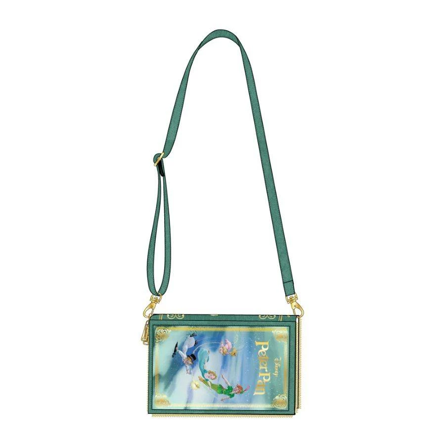 Celebrate the childlike wonder of Disney �s Peter Pan with a charming interpretation of the animated classic! The Loungefly Peter Pan Book Convertible Backpack portrays the story of the boy who never grew up. Resembling a book cover, the front of this bag features Peter Pan and the Darling siblings as they fly through the night sky. Gold foil details display the title and debossed motifs on the front, back, and �spine, � while Tinkerbell leaves a trail of pixie dust on the back. Open the bag up and you will find storybook-like artwork of the Darlings � trip to Neverland. Easily convertible, this bag can transform into a backpack with the book lying open against your back or can be worn closed as a crossbody purse. With secure zipper pockets disguised as book pages, this multi-function bag is the perfect accessory as you take flight on any adventure. The Loungefly Peter Pan Book Convertible Backpack is made of vegan leather (polyurethane). Bag has sturdy hardware and adjustable shoulder straps (removeable) that can convert into a backpack. Additional features include printed, debossed, and gold foil details. Notice the coordinating inside lining. This bag is an officially licensed Disney product. Bag dimensions: 16″ W x 9″ H x 2″D (Please note: width is measured across the bottom of the bag.)