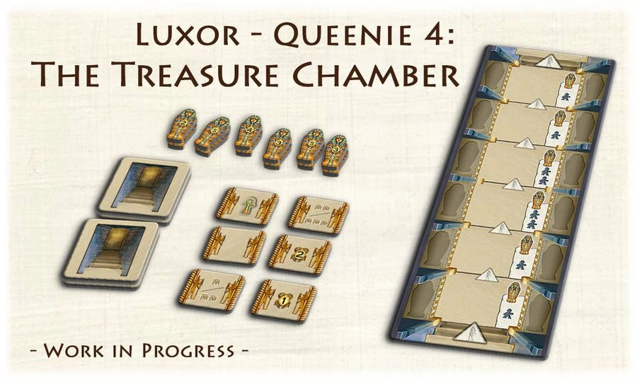 The treasure chamber is, like the name implies, filled with treasures that award many points. There are four entrances to the chamber around the game board. To open an entrance the treasure tile that is placed over the entrance has to be collected by a player. After that, every adventurer can enter the treasure chamber when he lands on one of the entrances. There you can find valuable treasures, but only if your quicker than the other players. Once a treasure is collected, it is gone. While it is lucrative to go through the treasure chamber, only when you get to the end, you will be back on the game board appearing on the last discovered entrance. Adventurers inside the treasure chamber at game end will award no points for the player. Go grab that treasure, but be sure to be back in time! Contents: 12 sarcophagi, 4 entrance tiles, 6 chamber tiles, and 1 treasure chamber board