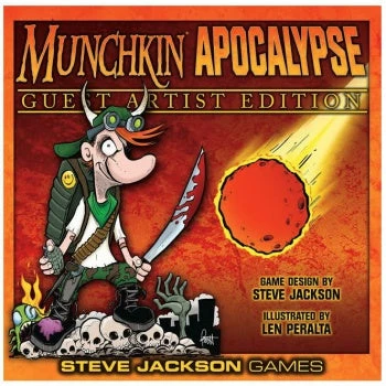 Celebrate 15 years of Munchkin with special Guest Artist Editions! This special Guest Artist Edition of fan favorite Munchkin Apocalypse gives you a whole new look for the end of the world! Enjoy all-new art while surviving every natural (and unnatural) disaster in a world full of people – and things – that want to kill you and take your stuff. Len Peralta, known for his work on Munchkin The Guild, the Ten State comic book, and his own Geek a Week trading cards, illustrates Munchkin Apocalypse, showing us his own unique take on the end of the world! This Guest Artist Edition includes completely re-illustrated game cards, a gameboard featuring Len Peralta’s Munchkin Apocalypse art, and male and female standies for each player. 180 cards, 12 player standies with plastic stands, gameboard, rulesheet, and a six-sided die.