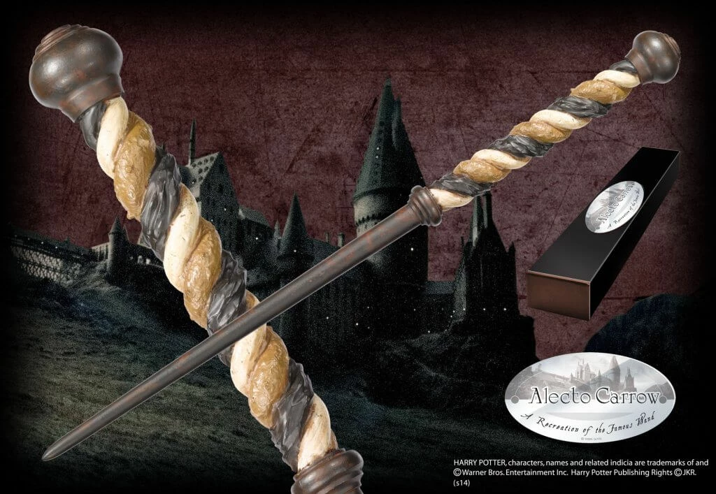 The wand of Alecto Carrow, Death Eater and temporary Muggle Studies teacher at Hogwarts. Character box contains name clip. Wand measures approx 33cm.