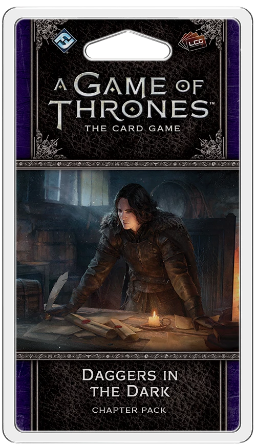 Daggers in the Dark is the sixth Chapter Pack in the Dance of Shadows cycle for A Game of Thrones: The Card Game. Featuring three copies each of twenty distinct cards, this pack draws you into the pages of A Song of Ice and Fire, where the key characters in the story find themselves surrounded by enemies as the shadows encroach. At the Wall, Jon Snow struggles with his duties as Lord Commander of the Night’s Watch as his brothers whisper dissension. In King’s Landing, Cersei Lannister attempts to keep the loyalty of the smallfolk as the Faith Militant stirs rebellion. And in Meereen, Daenerys Targaryen makes difficult sacrifices to win the hearts of the Meereenese as assassins plot her demise. With the return of the shadows mechanic from A Game of Thrones: The Card Game First Edition, your games become further steeped in mystery and intrigue as the paranoia threatens to tear you apart. With dangers at every turn, you must embrace the darkness or fall before those who do. How much of yourself are you willing to lose in order to win the Iron Throne?