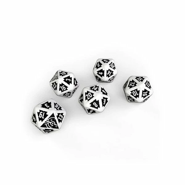- Contains 5 custom engraved twenty-sided dice in bleached bone-colored and black ink.