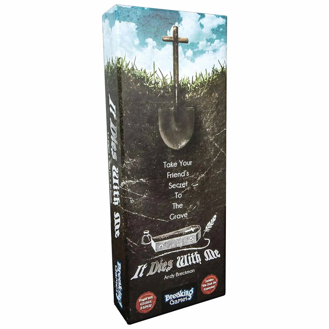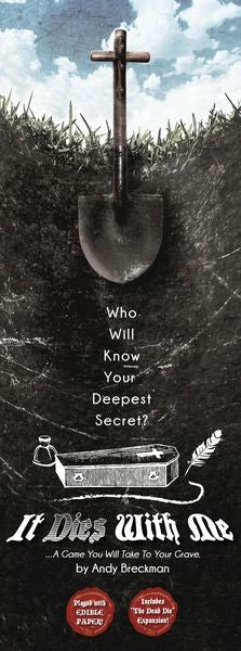In most games – even your favorite one – there’s nothing really serious at stake. But, It Dies With Me is different. Take a peek into the soul; the deep, dark, twisted heart of your opponent. The player that wins, will learn a secret, something never told to anyone! One player at the table has a secret, and it’s about them. They’ve even written in down and placed it in a secret envelope on the table. Do you want to read it? WIN THE GAME. The secret can never be shared, or be repeated. That’s because it’s written on EDIBLE PAPER with a FOOD COLORING MARKER, and it must be EATEN to make sure the secret DIES with the winner of the game! Each player (including the player whose secret is in the game) has one six sided die and a mini coffin. Players use their coffins to hide a secret die number they’ve chosen, trying to be the highest or lowest unique number. That’s right, no rolling of these dice. Players can choose any number from one to six. Everyone opens their coffin at the same time to see who wins each round. Choose wisely, or your number might get cancelled out! Each round there are TWO winners! One winner draws a card. The other moves their token. Players try to collect a set of four cards to form the phrase: IT – DIES – WITH – ME. OR, move their token across the six grave tiles, all the way to the SECRET ENVELOPE. Complete just one of these goals, and you win. You get to READ THE SECRET! Just remember, that secret must die with you.