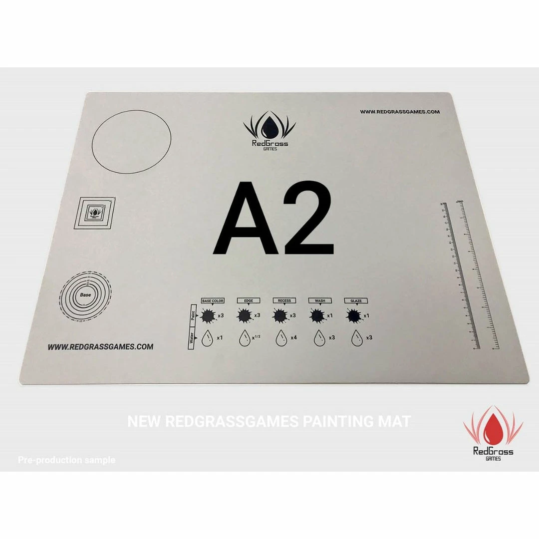 Protect your desk with the Redgrassgames cutting and painting mat for miniature painting. This custom-made painting mat comes in a neutral gray to help you focus on your painting session. Available in A3 format, it includes just the right amount of useful guides. Round and square checkers, dilution ratios for beginners, an inch/cm ruler, and the Redgrass color wheel! It is also your ideal cutting mat for all your hobbies. Self-healing but also double-sided, it will serve you a long time.