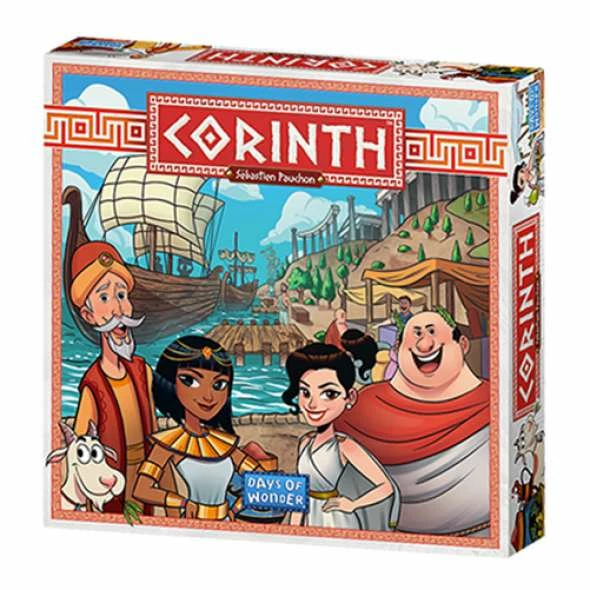 Under a blazing sun in 4th century BCE, traders come from all corners of the Mediterranean Sea to Corinth to sell their goods; Persian carpets, Cretan olive oil, Roman grapes, and Egyptian spices are highly prized by traders. Players have a few weeks to secure their place in Corinthian lore as its most savvy trader! Corinth is a roll-and-write game akin to a dice-only version of the board game Yspahan. At the start of a turn, the active player rolls nine dice, then places all the dice with the highest value on the gold space at the top of the chart, then starts placing dice from the bottom of the chart up, with each value of dice being on a separate level.