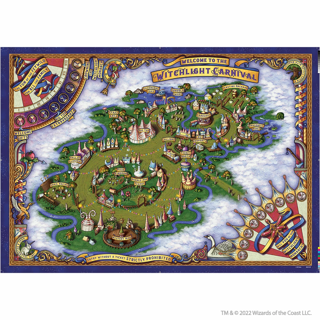 WizKids in collboration with Wizards of the Coast bring to you the first in our line of D&D inspired maps. This double-sided full color map features The Domain of Prismeer on one side and The Witchlight Carnival on the other. Printed on high-quality, tear-free vinyl measuring 29.875 x 21 inches.