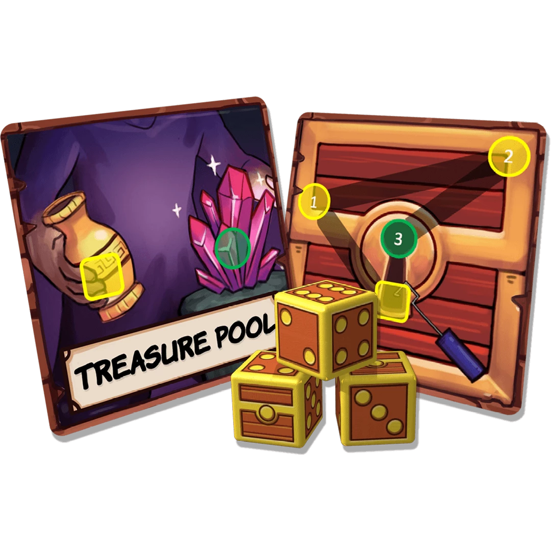 Treasure Trials and Lockpick Toolkits provide new challenges with great rewards! Comes with 4 Treasure Chest dice and 2 cards with special flick zones and rules.