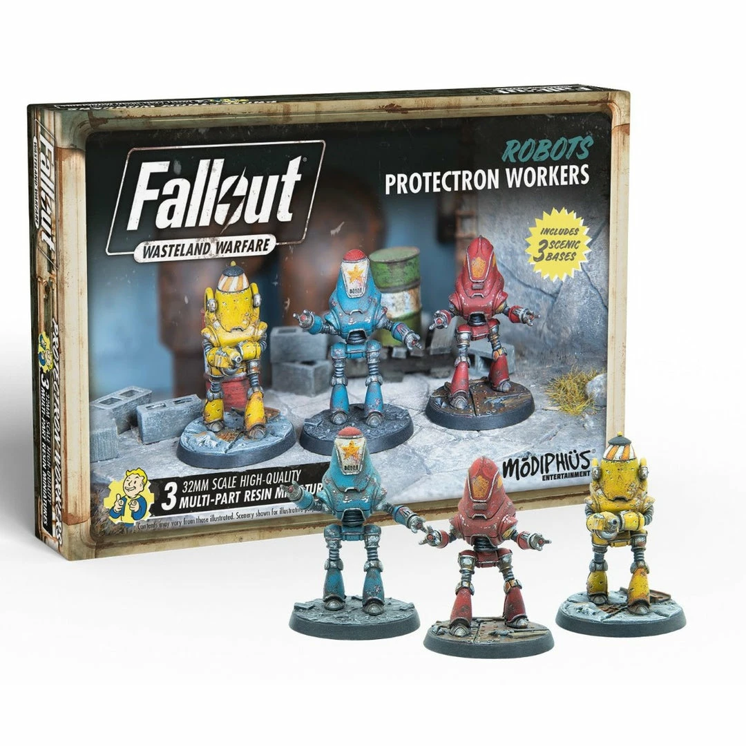 The new Commonwealth wave of miniatures and rules expansion for Fallout: Wasteland Warfare has arrived!  Protectrons are configured to serve a variety of purposes. All variants have sturdy bodies and inbuilt lasers for self defense. Any wanderer in the Commonwealth can expect to run across many of these robots, still roaming in an attempt to fulfill their last programmed input. The Protectron Workers set includes Protectron models designed for specific (and general) roles. Look out for other miniatures sets in the Commonwealth wave! Contents: 1x Police Protectron 1x Fire Brigadier Protectron 1x Utility Protectron 3x scenic bases              This Fallout: Wasteland Warfare set contains three 32mm scale high-quality multi-part resin miniatures with scenic bases. Requires some assembly. Supplied unpainted.Â