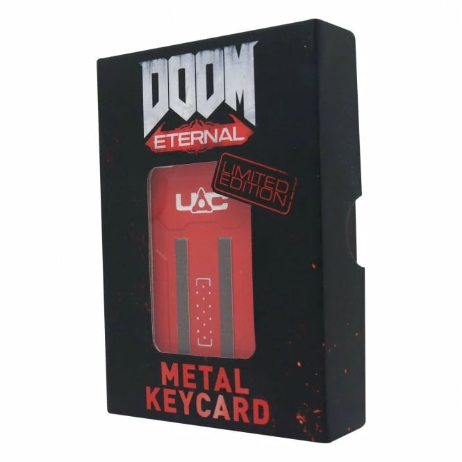An in-game replica from 2020’s Doom Eternal, this embossed metal card is painted in red and features the UAC logo on it.