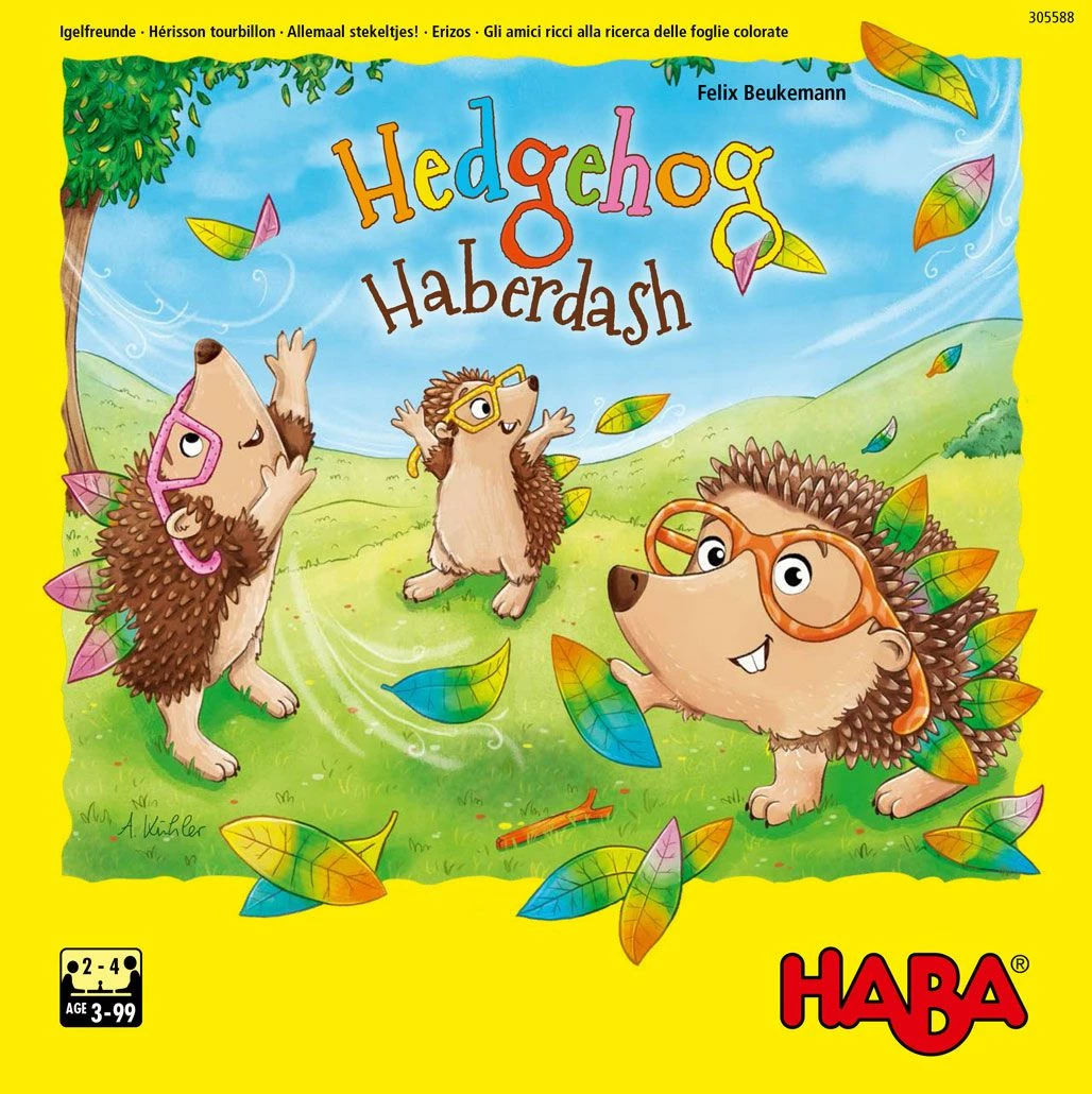 The hedgehog children are playing dress-up and want to have big spines in their favorite colors. To do this, the players need to draw leaves with the right colored points out of the leaf bag, but be careful! The wind can blow the leaves around so that even leaves you thought were safely yours fly away again! The first player to completely decorate their hedgehog with leaves in their color wins Hedgehog Haberdash.
