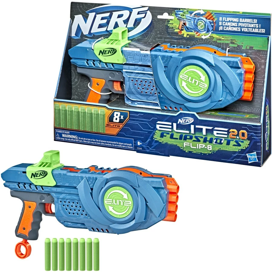 - flip into battle: nerf elite 2.0 flipshots flip-8 blaster features 8 barrels, 4 facing front and 4 facing back. fire darts from the 4 front barrels, then flip the rear barrels forward to keep on firing