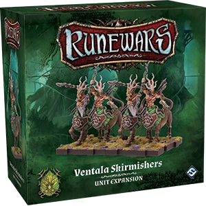Defend the borders of the Aymhelin Forest with the Ventala Skirmishers Unit Expansion for Runewars Miniatures Game! Since they first appeared in Mennara centuries ago, the Ventala have developed a deep friendship with the Latari. Now, these enigmatic creatures are proud to offer their services as scouts and warriors whenever darkness threatens to fall over the Aymhelin. Pledge your loyalty and protect your elven allies, no matter the cost! The Ventala Warriors Unit Expansion includes four plastic figures, two cavalry movement trays, one command tool, a collection of tokens, and twelve upgrade cards to further customize your elven army!