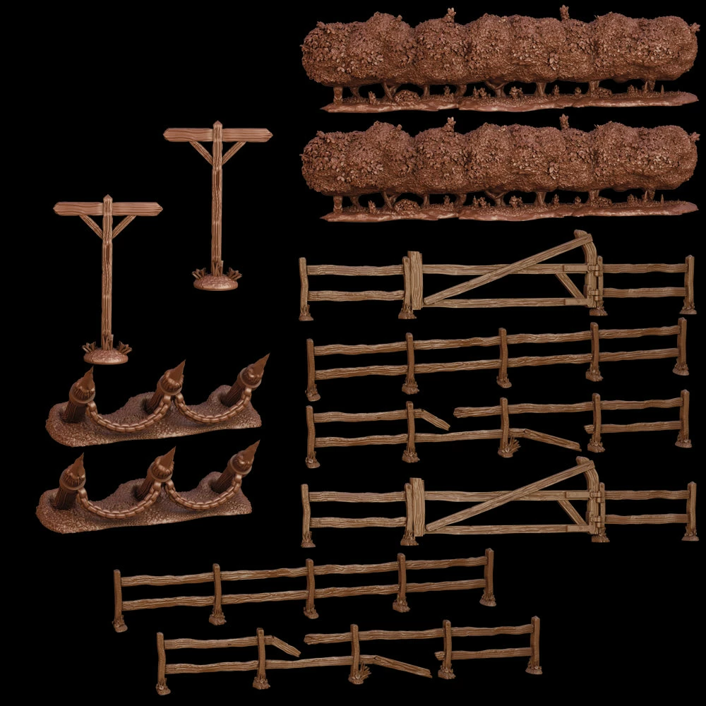 Many fantasy battles are fought over abandoned farmsteads and hastily erected defences. This set includes fences, hedges, archers’ stakes, and signposts. These perfect as obstacles for Kings of War or any other fantasy battle game.