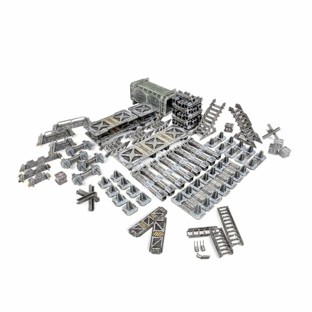 1x Large Platform • 2x Medium Platforms • 2x Small Platforms • 8x Tall Legs • 16x Short Legs • 4x Leg Extenders • 12x Double Feet • 8x Single Feet • 2x Tall Stairs • 3x Short Stairs • 1x Container • 2x Tank Jacks • 5x Small Crates • 1x Long Tall Barricade • 1x Medium Tall Barricade • 1x Narrow Tall Barricade • 1x Long Short Barricade • 1x Medium Short Barricade • 1x Narrow Short Barricade • 1x Tall Ladder • 1x Medium Ladder • 1x Short Ladder • 1x Long Catwalk • 1x Short Catwalk • 3x Ladder Stands