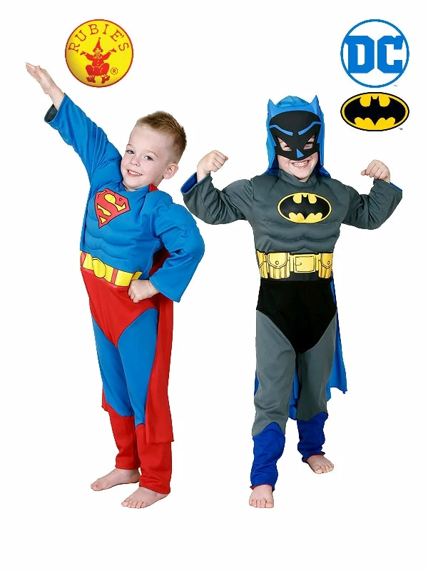 - Reversible jumpsuit in polyester with fibre filled muscle chest bodice and stitching details, Bat logo and Superman logos printed plus belt prints at waist