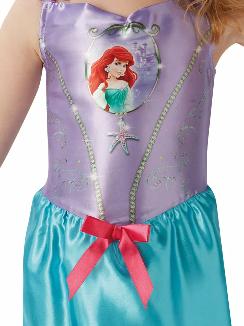 - Dress with purple satin bodice featuring printed character pendant in centre and printed sequin design