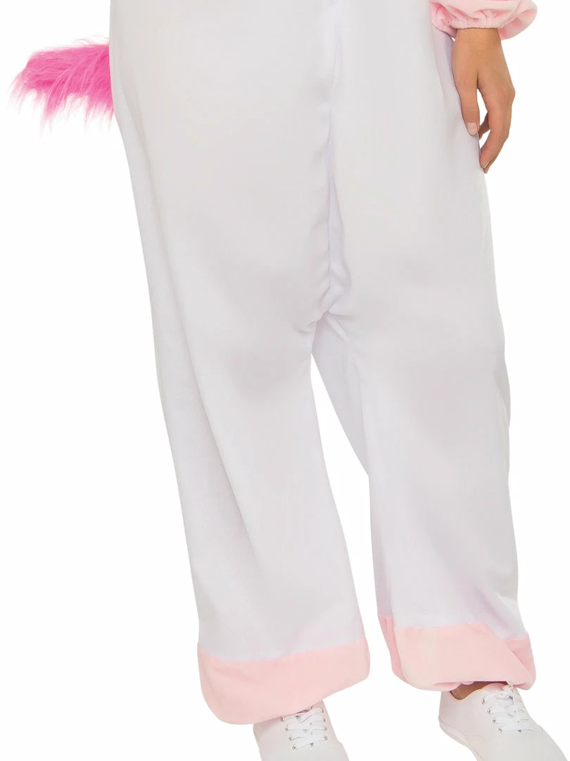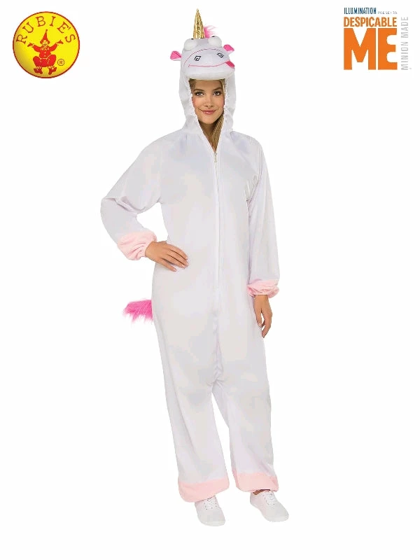 - Jumpsuit features 3D unicorn head with attached eyes and ears plus fibre filled gold unicorn horn and elastic around the face for comfort