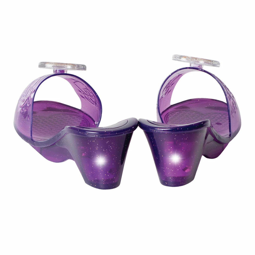 - Soft plastic purple shoe with slight heel and gold glittery design throughout plus light up function in the heel