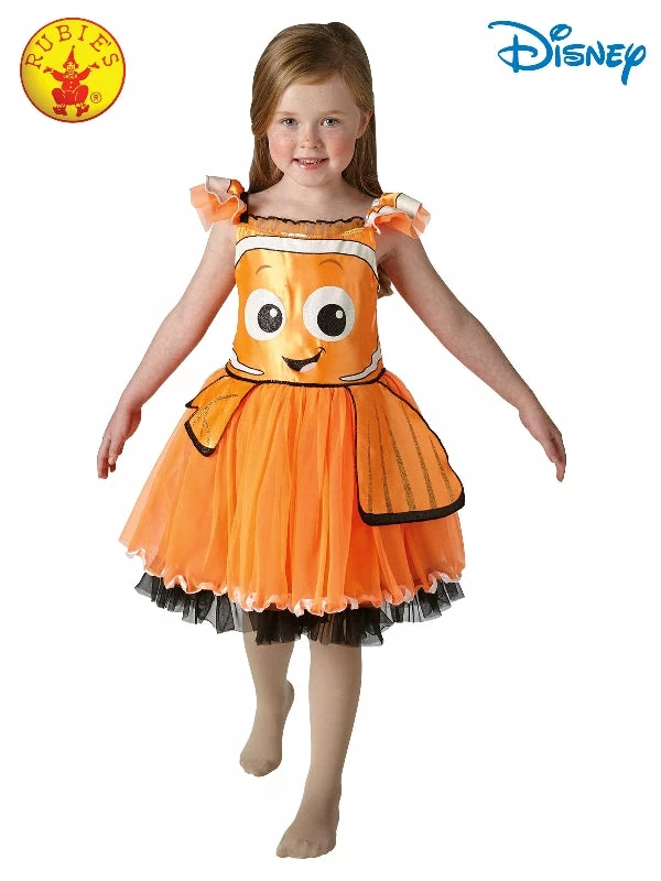 - Tutu dress with digitally printed Nemo face on satin bodice featuring glitter highlights. Bodice features black, orange and white tulle at neckline and on shoulder straps