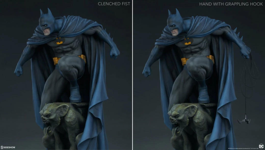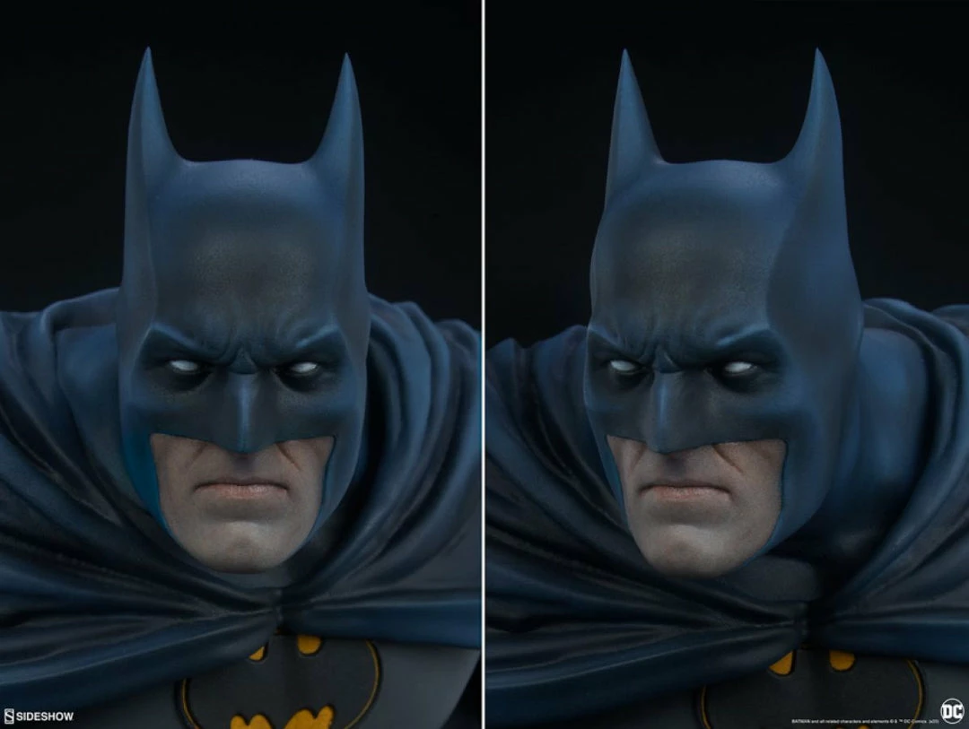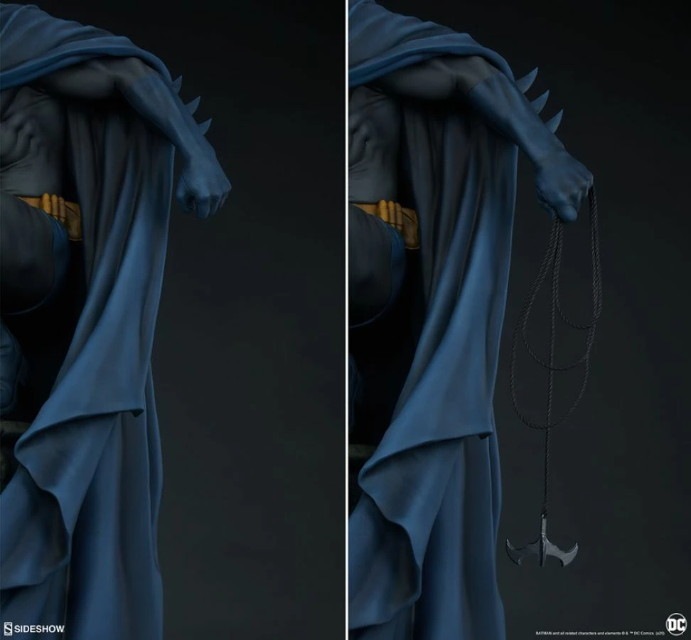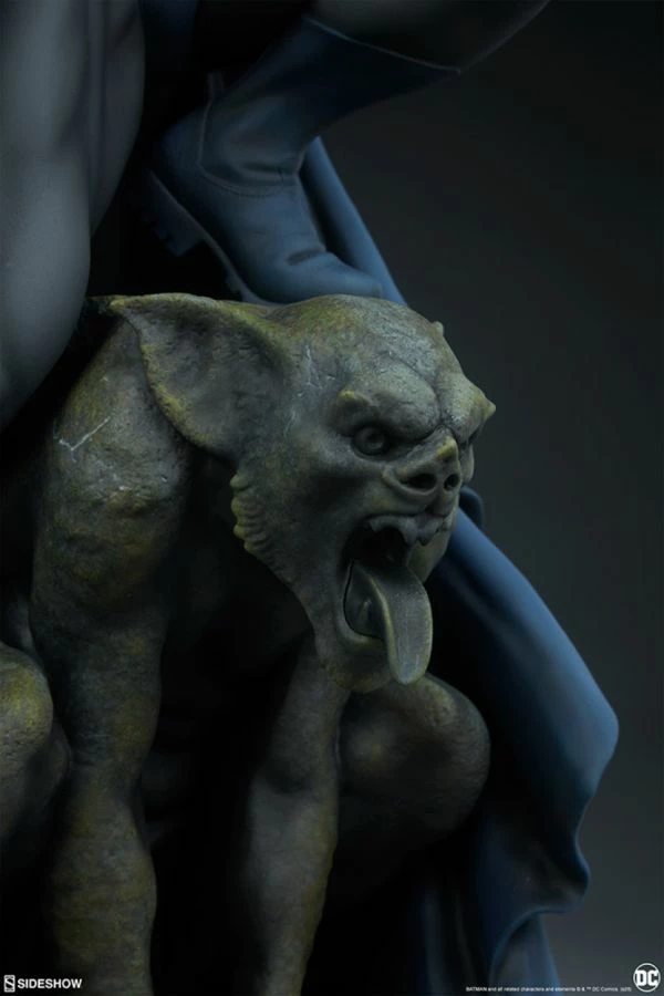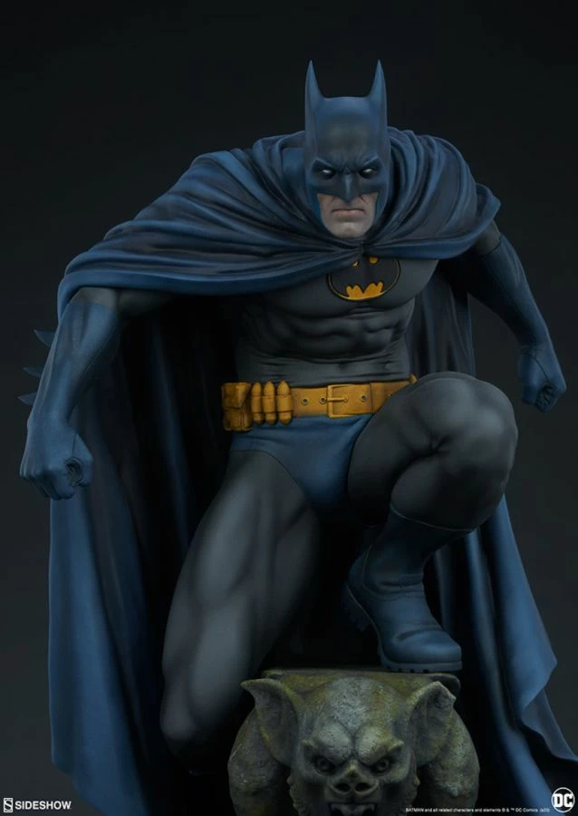 “I made a promise on the grave of my parents that I would rid this city of the evil that took their lives.” Sideshow presents the Batman Premium Format Figure, waiting in the shadows to join your DC Comics collectibles. The Batman Premium Format Figure measures 22.5″ tall, cloaked against the dark skies of Gotham City as he joins the lurking gargoyles that watch the streets below. Crouched in wait, Batman observes from the perfect vantage point to get the drop on his foes and dish out his signature brand of justice. The Batman Premium Format Figure features a fully sculpted blue and grey costume, from the top of his stoic cowled portrait to the bottom of his dramatic, swooping cape. Immensely detailed in dark blues and blacks, Batman �s cape takes on a life of its own as it melds Bruce Wayne with the gothic architecture of his crime-ridden city. His costume features yellow accents on the utility belt and his iconic bat-symbol completing the grim appearance of the legendary Caped Crusader. The Batman Premium Format � Figure also comes with a swap-out left hand, giving you the choice to display him with closed fists or clutching a grappling rope. Take your DC Comics collection to the rooftops of Gotham and bring home the Batman Premium Format Figure today!