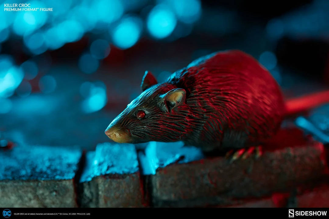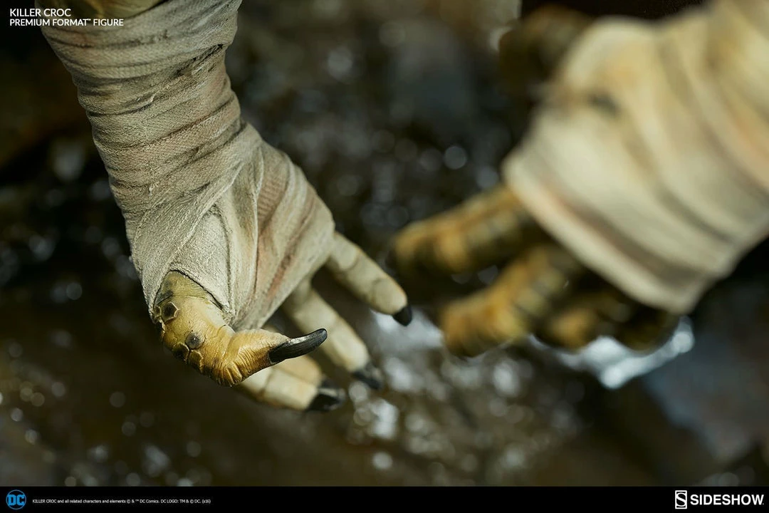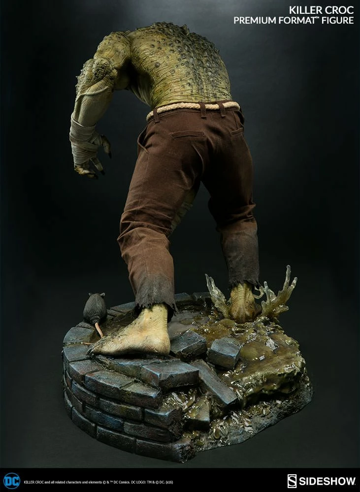Killer Croc might not be the brightest villain to ever grace the pages of DC Comics, but he is one of the toughest and most brutal. Constantly stepping up against Batman, and occasionally other super-villains, Killer Croc is as formidable an opponent as he is a statue. Sideshow’s Killer Croc Premium Format Figure captures the physicality and anger that DC collectors expect from this misshapen villain. Poised to stomp through the sewers, Croc’s feet are kicking up a splash as a rat scurries around him. Clad in weathered fabric pants and rope belt, one gets an idea that this is a man or beast that has been living rough on the edge.