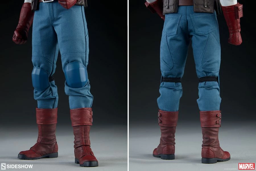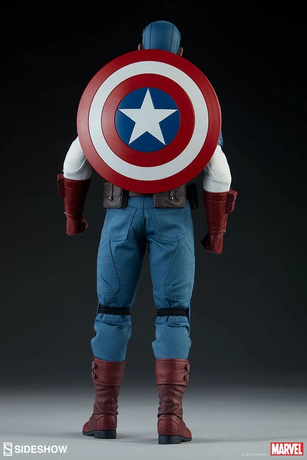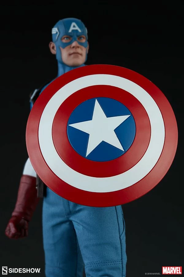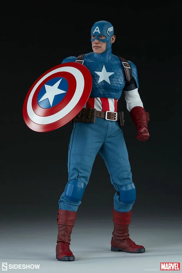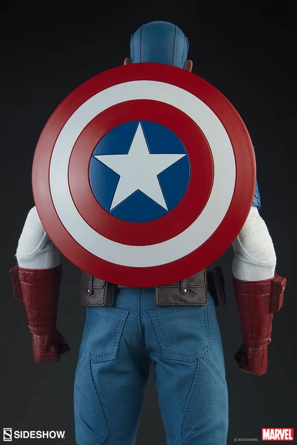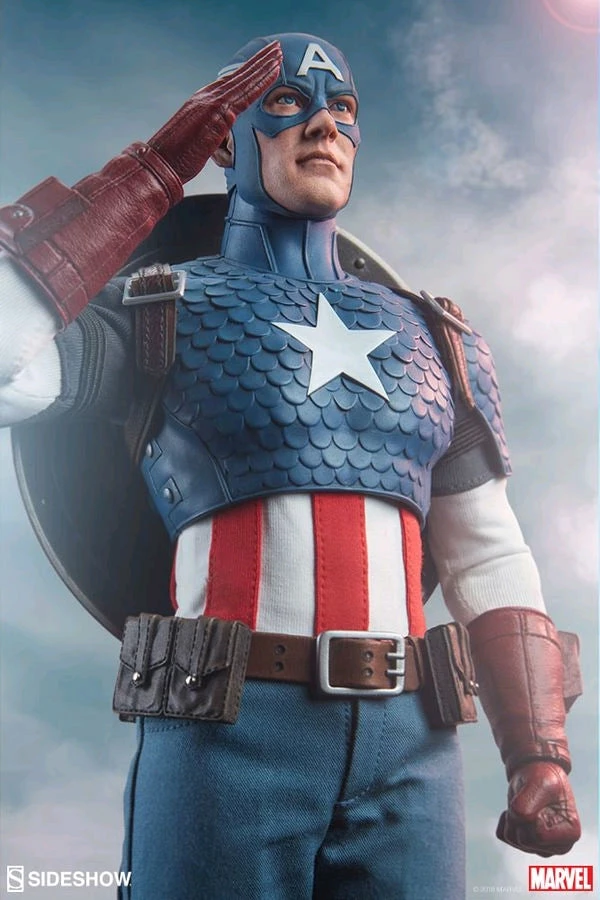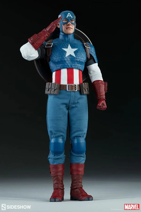 “So this is like the old days, gentlemen. All in!” Sideshow is proud to present the Captain America Sixth Scale Figure. The Captain America Sixth Scale Figure joins the ranks of Sideshow �s Marvel Sixth Scale collection with his legendary shield at the ready. Captain America has a stylized head sculpt with his blue helmet, complete with white helmet wings and traditional �A � logo, with a heroic and poseable body design. The Captain America Sixth Scale Figure has a custom-tailored fabric uniform in his famous red, white, and blue color scheme, detailed with scaled chest and shoulder armor on his upper torso. The star-spangled Avenger has a belt with pouches, a set of shoulder straps with a magnetic star-shaped shield mount, and magnetic shield mounts in his wrist gauntlets. This highly detailed figure also features a pair of sculpted boots, a pair of kneepads, and seven different gloved hands including a pair of fists, a pair of grip hands, a shield-throwing hand, a relaxed hand, and a salute hand. Lead the charge and add the Captain America Sixth Scale Figure to your Marvel collectibles today!