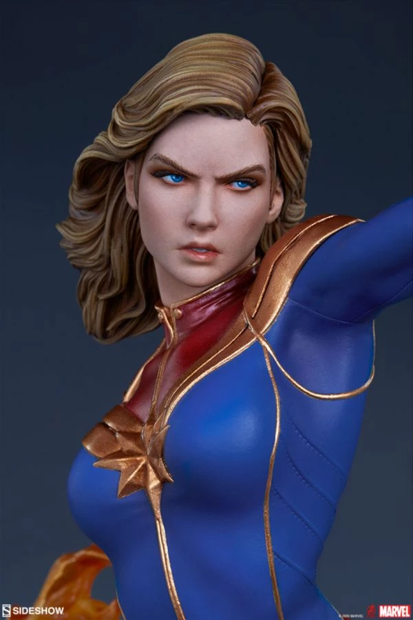 “Don’t you ‘lady’ me, son. I �m an Avenger.” Sideshow presents the Captain Marvel Statue, taking the Avengers Assemble Statue Collection even higher, further, faster than before. Inspired by some of Marvel �s most iconic characters, the 1:5 scale Avengers Assemble collection captures the colorful and battle-ready styles of Earth �s Mightiest Heroes! The polyresin Captain Marvel statue measures 16″ tall as Carol Danvers launches herself skyward, prepared to let loose a powerful photon blast from her right fist as she leaves a trail of orange and yellow energy in her wake. This fearless fighter is prepared to punch holes in the sky to overcome even the deadliest of foes. Captain Marvel’s iconic blue, red, and gold uniform is fully sculpted and features windswept red sashes and a raised gold Hala star on her chest. Her long-haired portrait captures the stern determination of this former Air Force pilot-turned-Avenger, making her a mighty addition to your Marvel collectibles. Pair Captain Marvel with her allies like Captain America, Black Widow, and Iron Man, or pit her against the villainous Thanos to create an earth-shattering showdown on your shelf. Each of the Avengers Assemble Statue Collection features a rubble-covered proximity base that stands alone or complements others to create an atmospheric battle environment. Bring home some star-power and recruit the Captain Marvel Statue for your collection today!