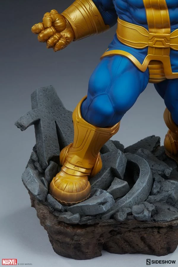 “In the end, as always, Thanos will stand triumphant.” Sideshow presents the Thanos (Classic Version) Statue, eager to face the heroes of the Avengers Assemble Statue Collection. Inspired by some of Marvels most iconic comic book characters, the 1:5 scale Avengers Assemble collection captures the colorful and battle-ready styles of Earths Mightiest heroes- and now, their greatest foe! The polyresin Thanos (Classic Version) Statue measures 23″ tall, as the Mad Titan stands triumphantly atop the wreckage of Avengers Tower. Inspired by his classic comic book appearance, Thanos wears a fully sculpted vibrant blue bodysuit with detailed metallic yellow armor. Wielding the mighty Infinity Gauntlet, which includes a light-up feature for the Infinity Stones, this nigh-unstoppable villain will prove that Earths Mightiest Heroes are no match for the ultimate cosmic overlord. The Thanos (Classic Version) Statue also includes two purple portraits of the deviant Eternal, one featuring his signature wicked grin as he gazes up at his powerful gauntlet, the other with a grimace as he looks forward at his incoming foes. Pair Thanos with the heroes of the Avengers Assemble collection, including Captain America, Iron Man, Black Widow, and the Hulk to create an epic battle scene in your universe of Marvel Collectibles. When the dust settles, who remain standing? Come and get the Thanos (Classic Version) Statue for your Marvel collection today!