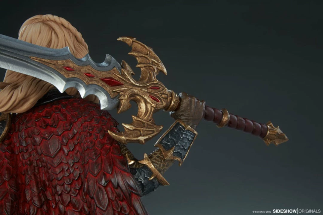 “Everything I am, everything I do, is because of the dragons that plague this land.” Sideshow presents the Dragon Slayer: Warrior Forged in Flame Statue, an original fantasy character who will become a living legend in your collection. The Dragon Slayer: Warrior Forged in Flame Statue measures 18.75″ tall, standing atop the desiccated remains of a slain red dragon. Murky corruption drips from its skull, relinquishing its hold on the dreaded beast, which has been partially stripped of its scales and horns to reinforce the heros incredible armor. Victorious this day, the Dragon Slayer surveys the battlefield in search of more fiends to subdue. The polyresin Dragon Slayer Statue is fully sculpted with intricate detail from head to toe, bringing fantastical action to every aspect of this original figure. In the fight against dragons, this warrior woman has armed herself with protective aspects harvested from her fallen foes- black and gold horn armor, scaled vestments, and a red dragonskin cape guard her from the flames and claws of these brutal beasts. Once in striking range, it is up to her serrated hunting knife and legendary greatsword, both freshly stained with dragon blood, to finish the deadly job. The Dragon Slayers battle-hardened look is completed with fierce blonde braids and a stripe of smoky makeup across her eyes, her gaze stern as she faces down the most frightening creatures ever beheld by humanity. Arm your collection for an epic battle and bring home the Dragon Slayer: Warrior Forged in Flame Statue from Sideshow Originals today!