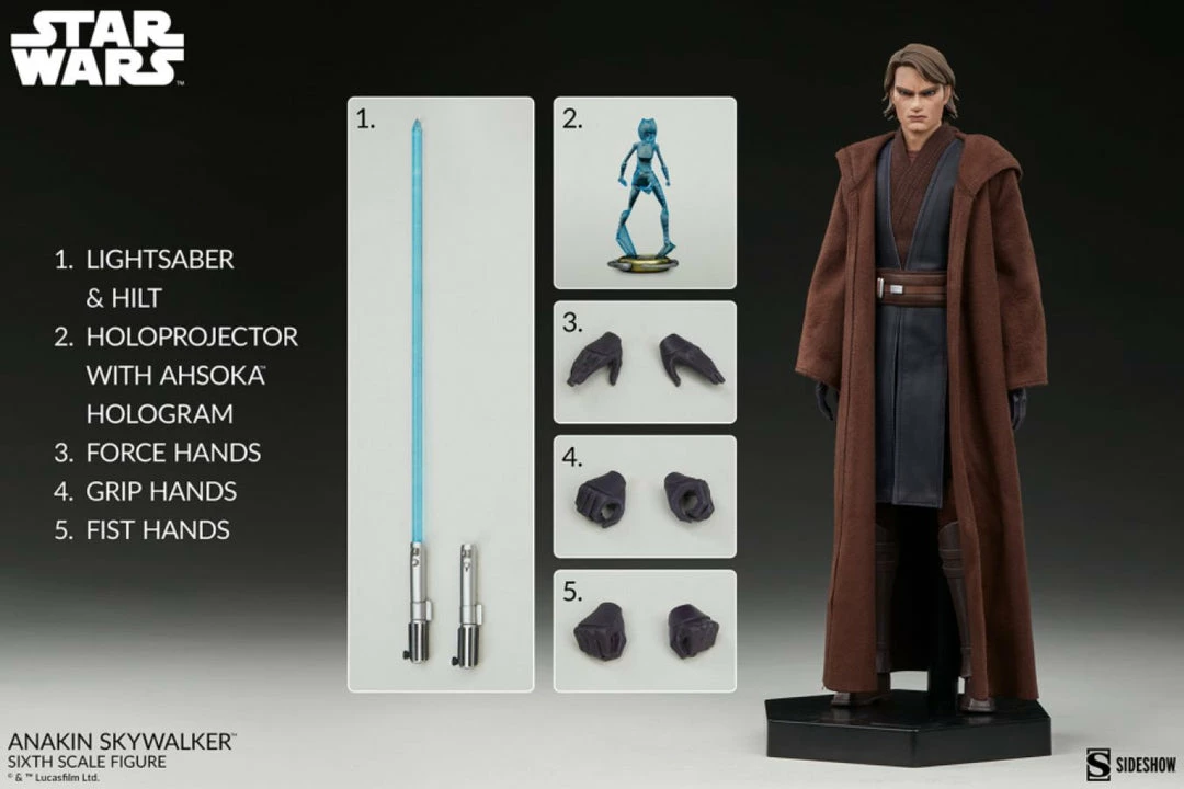 “More than you realize, I understand wanting to walk away from the Order.” Sideshow presents the Anakin Skywalker Sixth Scale Figure, inspired by the character �s iconic animated appearance in Star Wars �: The Clone Wars. The Anakin Skywalker Sixth Scale Figure captures the Jedi Knight �s distinct design from the fan-favorite animated series The Clone Wars, as he works to keep the galactic peace alongside the Jedi Order. This articulated figure features a stylized headsculpt and a carefully tailored fabric costume consisting of a Jedi robe, tunic, undershirt, tabards, pants, a sash, a belt with sculpted accessories, and sculpted boots and gauntlets to create his signature uniformed look. The Anakin Skywalker Sixth Scale Figure includes a number of stylized hands and swap-out accessories to give collectors a wide range of display options for the Jedi general. Anakin Skywalker comes with four pairs of stylized hands including a pair of grip hands, a pair of neutral hands, a pair of force hands, and a pair of fists for a wide variety of gestures and pose combinations. In addition, he comes with both a lightsaber hilt and lightsaber with its blue tapered blade unleashed for battle action. Finally, Anakin includes a holoprojector accessory with a sculpted Ahsoka Tano hologram for communicating with his Padawan.