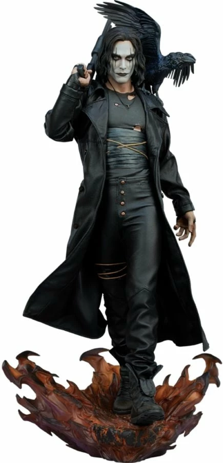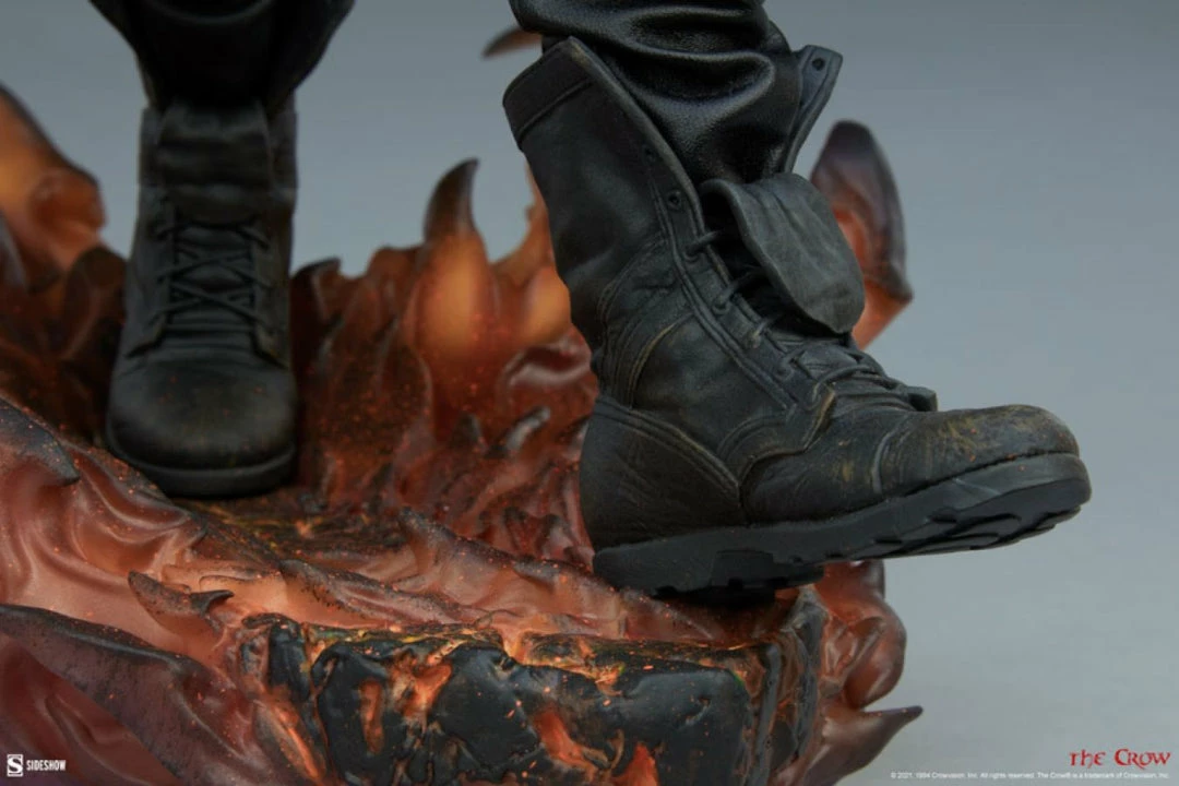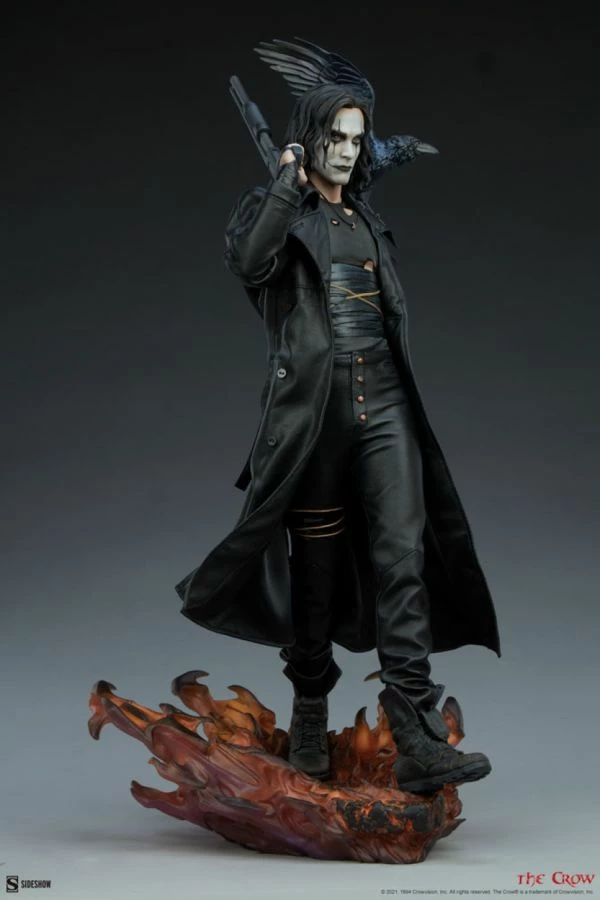 “They’re all dead. They just don’t know it yet.” Sideshow presents The Crow Premium Format Figure, a must-have cult classic movie collectible. The Crow Premium Format Figure measures 22″ tall and 11.38″ wide as Eric Draven, fresh from the grave, stalks through raging flames to exact his revenge on the men who ruined his life. Based on the likeness of actor Brandon Lee in the unforgettable role, the undead antihero rests a shotgun on his shoulder while the mysterious crow guides his vindictive path, wings outstretched. His portrait features his iconic face makeup, sculpted hair, and a somber look encapsulating his tragic transformation. The Crow Premium Format Figure features a mixed media costume application, blending sculpted and tailored elements to recreate Eric Draven’s signature gothic appearance in scaled collectible form. The morbid musician wears a pair of black fabric pants carefully fitted to the figure as he walks, and his fabric trench coat features wire in the hem for dramatic posing. Draven also sports a sculpted black shirt riddled with tears, sculpted black tape wraps on his waist and arms to cover his wounds, and sculpted black boots scuffed with elements of distress. He wears Shelly Webster’s ring around his neck, close to his heart, as a reminder of what he lost on that fated Devil’s Night. It can’t rain all the time – fire it up in your collection and bring home The Crow Premium Format Figure today.