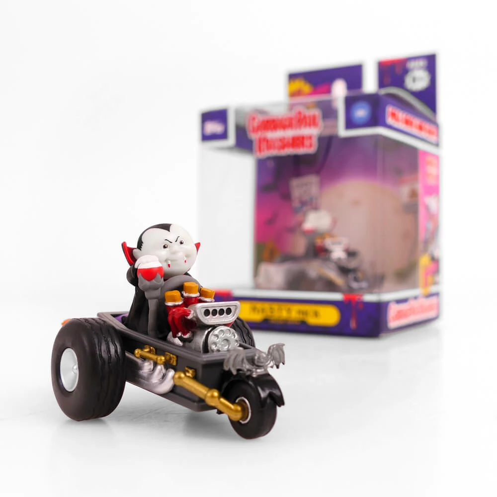 Introducing GPK Krashers! Mighty Three-Inch pull back racers speeding past 30 feet on a single pull-back! The first in a long list of pull back racers from The Loyal Subjects! Classic Garbage Pail stylings, and characters reimagined as speedy pull back racers aimed at “krashing” recklessly into each other as Garbage Pail Kids do! The first wave will include Adam Bomb in his “Atomic Bomber”, and Nasty Nick in his “Chiller Coffin”! Packaged in a colorful display box and includes a GPK collector card ONLY offered with the Krashers vehicles.