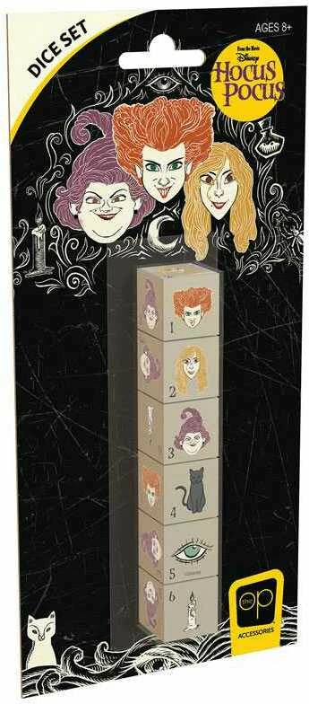 Take the Sanderson Sisters to your next game night with this Salem-approved set of dice! This 6-sided dice set features your favorite characters from pop culture Halloween classic including Winifred, Sarah, Mary, Thackery Binx, and other spooky icons.