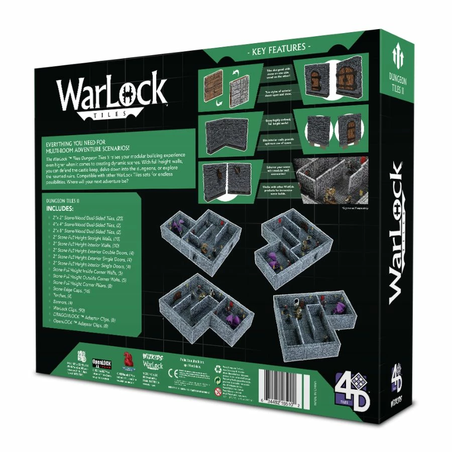 The newest additions to the highly anticipated WarLock Dungeon Tiles line from WizKids are finally available for release! After a year of R&D, Wizkids has perfected the dungeon tile. The WarLock Dungeon Tile system solves many of the problems presented with other tile systems. The WarLock clips allow players to construct rooms in advance and place them on the table as needed. Full height 2″ tall walls are perfect for players that want a deeper immersion into their game play. Offset walls provide you with the ability to place figures in any square on the grid, without pesky corners eating into your play area. Experience a perfect, continuous grid through the entire play space with our patented, modular, ultra-slim interior walls. Additionally, all tiles are reversible with wood design on one side and stone on the other for double the functionality! We’ve also included adaptor clips for two of the most popular clip-based tile systems, DRAGONLOCK and OpenLOCK, to help players integrate these tiles into their collection. Key Features: Modular High Utility (Double-Sided) Extraordinary Definition Fantastic Value FLGS Release (No KickStarter) Works With Existing WizKids Products This set includes: 4x – 2″ Stone Full Height Exterior Double Doors 4x – 2″ Stone Full Height Exterior Single Doors 10x – 2″ Stone Full Height Straight Walls with Accessory Port 10x – 2″ Stone Full Height Interior Walls 4x – 2″ Stone Full Height Interior Single Doors 8x – Full Height Stone Corner Pillars 5x – Stone Full Height Inside Corner Walls 5x – Stone Full Height Outside Corner Walls 2x – 4″x 4″ Stone/Wood Dual-Sided Tiles 20x – 2″x2″ Stone/Wood Dual-Sided Tiles 2x – 2″x 8″ Stone/Wood Dual-Sided Tiles 16x – Stone Edge Caps 90x – WarLock Clips 8x – DRAGONLOCK Adaptor Clips 8x – OpenLOCK Adaptor Clips 4x – Torches 4x – Banners About WarLock Tiles: The WarLock Tile system solves many of the problems present with other tile systems. The WarLock clips allow players to construct rooms in advance and place them on the table as needed. Our 1″ tall walls make it easier for players to move pieces around in the room as they play. Offset walls provide you with the ability to place figures in any square on the grid, without pesky corners eating into your play area. Experience a perfect, continuous grid through the entire play space with our patented, modular, ultra-slim interior walls. Additionally, all tiles are reversible with wood design on one side and stone on the other for double the functionality!