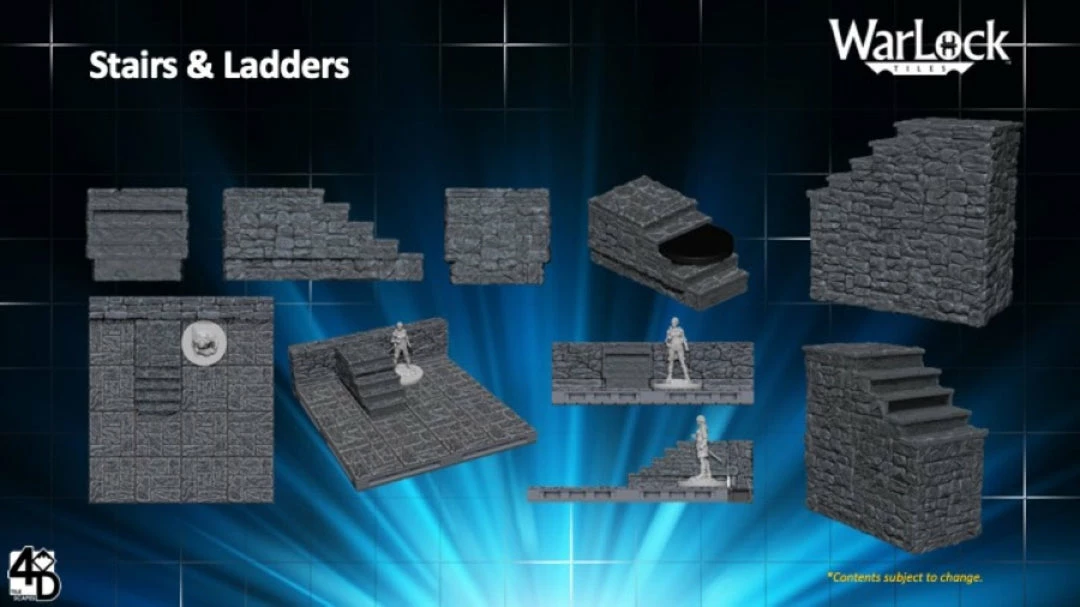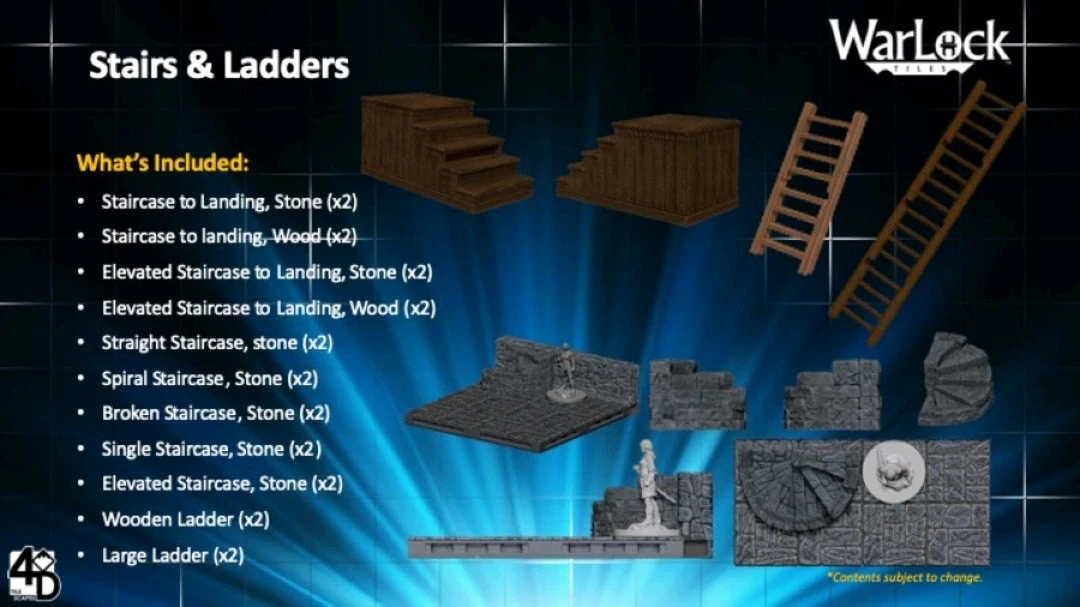 The highly anticipated WarLock Tiles: Stairs & Ladders set from WizKids is finally available for release! With Stairs & Ladders, you’ll have everything you need for a multi-floored scenario. Mix and match with other WarLock Tiles for even larger adventure setups. Key Features: Expands your play area by creating Multi-Story Buildings Modular System Allows You to Build Even More Configurations Engineered so Figures Can Be Placed on Stairs Pre-Painted Extraordinary Definition Expansive Variety of Items to Add to Your Scenes Fantastic Value FLGS Release (No KickStarter) Works with Existing WizKids Products This Set Includes the following: 2x – Staircase to Landing (Stone) 2x – Staircase to Landing (Wood) 2x – Elevated Staircase from Landing (Stone) 2x – Elevated Staircase from Landing (Wood) 2x – Straight Staircase (Stone) 2x – Spiral Staircase (Stone) 2x – Broken Staircase (Stone) 2x – Single Staircase (Stone) 2x – Elevated Staircase (Stone) 2x – Wooden Ladder 2x – Large Ladder About WarLock Tiles: The WarLock Tile system solves many of the problems present with other tile systems. The WarLock clips allow players to construct rooms in advance and place them on the table as needed. Our 1″ tall walls make it easier for players to move pieces around in the room as they play. Offset walls provide you with the ability to place figures in any square on the grid, without pesky corners eating into your play area. Experience a perfect, continuous grid through the entire play space with our patented, modular, ultra-slim interior walls. Additionally, all tiles are reversible with wood design on one side and stone on the other for double the functionality!